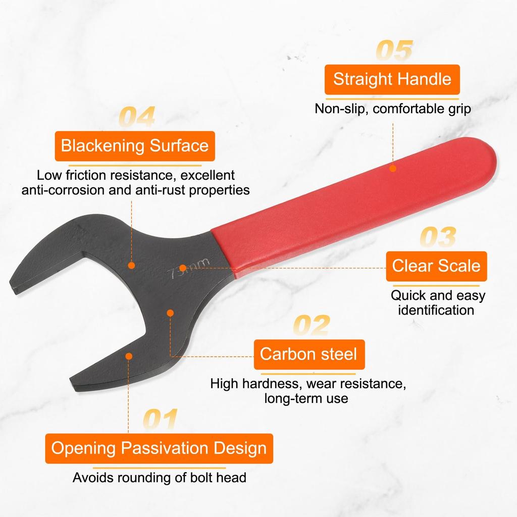 Our single open-end wrench is made of high-hardness, wear-resistant carbon steel. The black oxide finish prevents rust and corrosion, extending the tool's lifespan. The 15-degree opening angle improves accessibility in tight spaces. The innovative design efficiently connects with fasteners and ensures optimal performance in tight environments. The red handle makes it comfortable to hold, and the clear, easy-to-read specifications engraved on the wrench make it quick and easy to select the appropriate wrench size for different bolt sizes. It is primarily used to tighten and loosen flat-sided nuts and bolts, and is particularly suitable when socket wrenches or adjustable wrenches are difficult to reach due to space constraints. It is widely used in auto repair, plumbing, furniture assembly and repair, mechanical repair, construction, and DIY projects. Before purchasing, measure the opposite side of the screw and nut with a caliper to select the appropriate open-end wrench. Always use the appropriate size wrench to avoid rounding the bolt head or damaging the wrench.