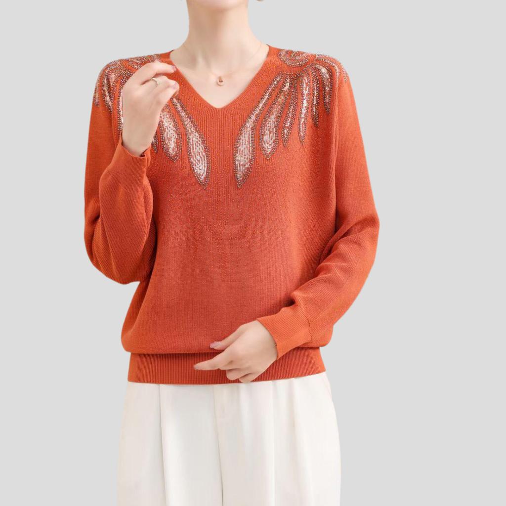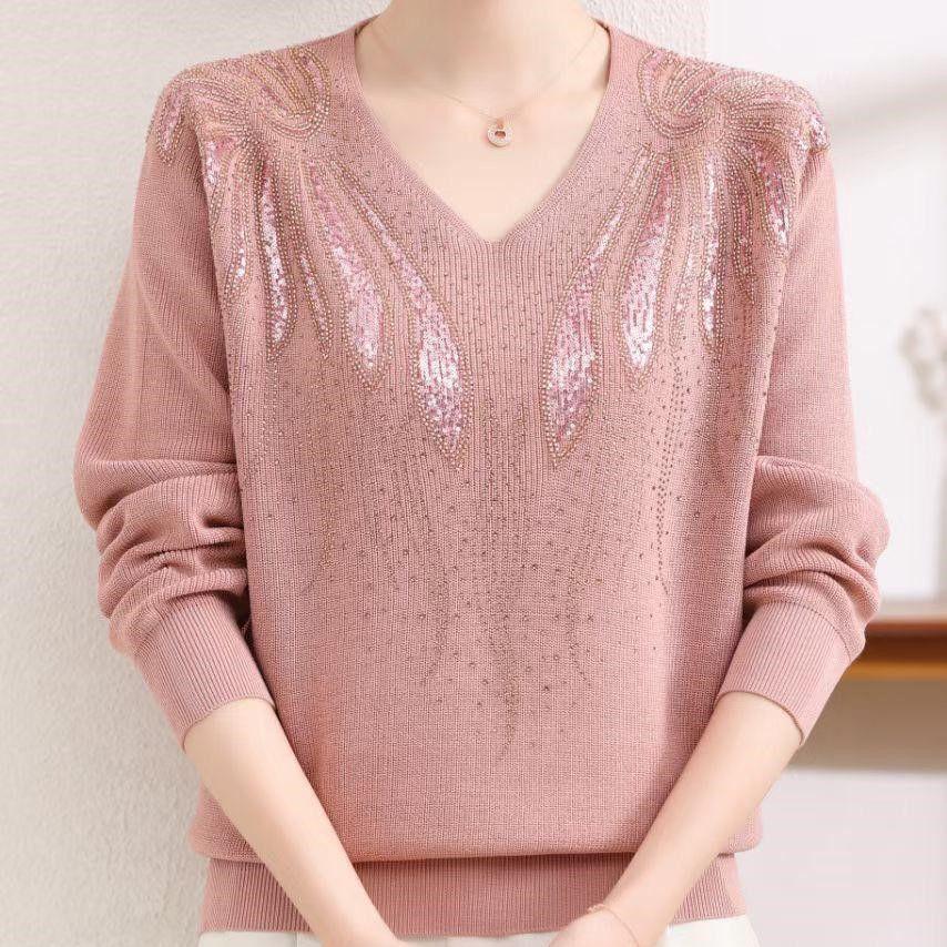 Весенне-осенний женский свитер с V-образным вырезом, свободный пуловер со стразами, вязаный топ, однотонный свитер большого размера