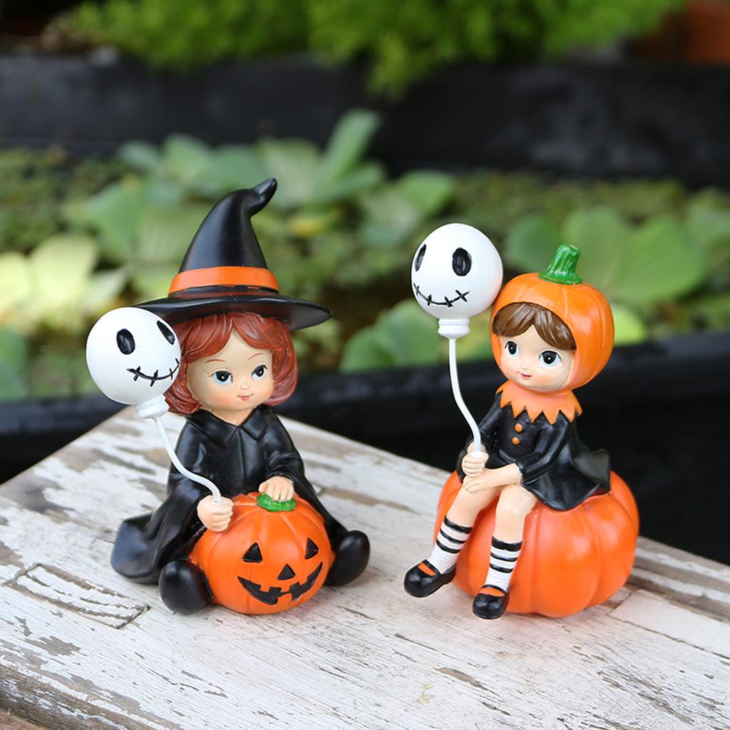 2pcs pumpkin witch sisters flowers, creative Halloween garden micro landscape scene layout, witch holding balloons, family gifts