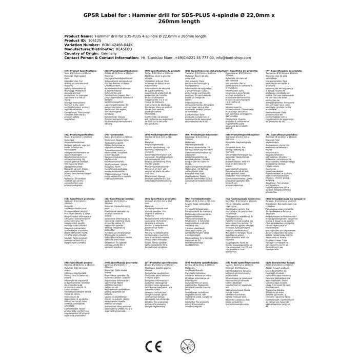 Foret à percussion pour SDS-PLUS 4 tranchants Ø 22,0mm x 260mm longueur
