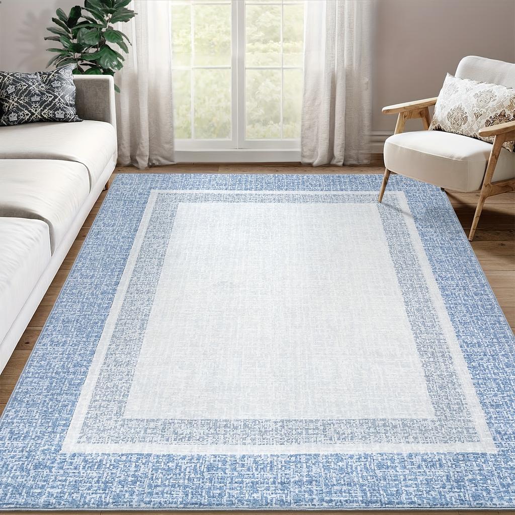 Современный потертый сине-белый ковер для зоны Мягкий низкий ворс Машинная стирка Нескользящая основа Гостиная Спальня Офис Кухня