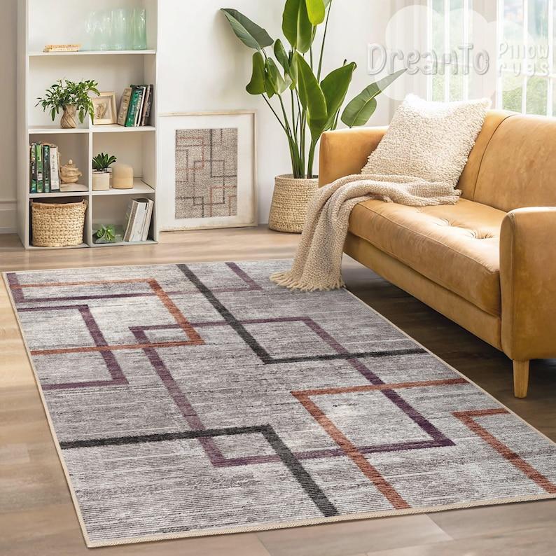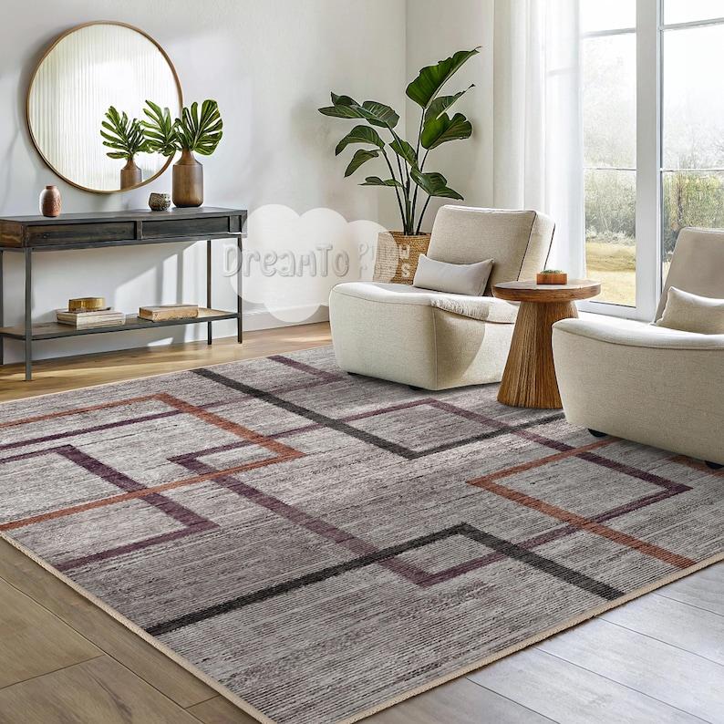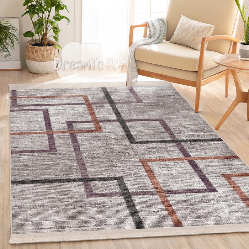 Современный геометрический ковер с фиолетовыми линиями - Минималистичный светло-серый ковер - Ржаво-оранжевый художественный плед в клетку