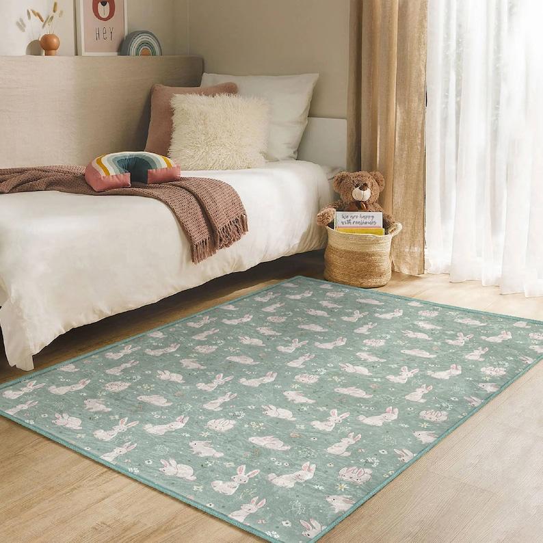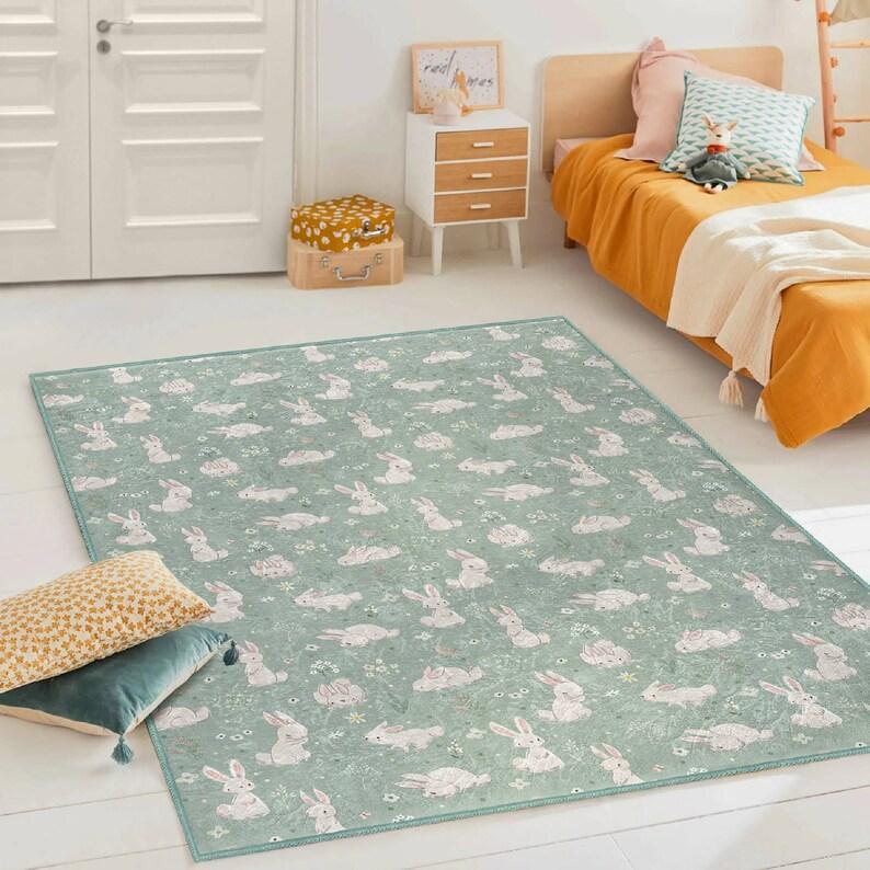 Коврик для детской комнаты 'Зеленый лес с кроликом' Ковер для детской комнаты Ручной работы Детские ковры Ручной работы Коврик для детской комнаты Милый кролик Детские коврики