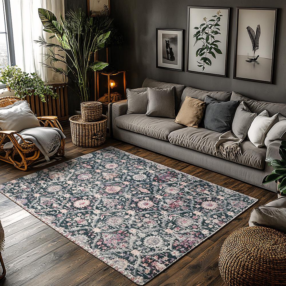Темно-синий ковер в богемном стиле с цветочным узором, фиолетово-розовый узор, нескользящий ковер, уютный коврик для гостиной для домашнего декора