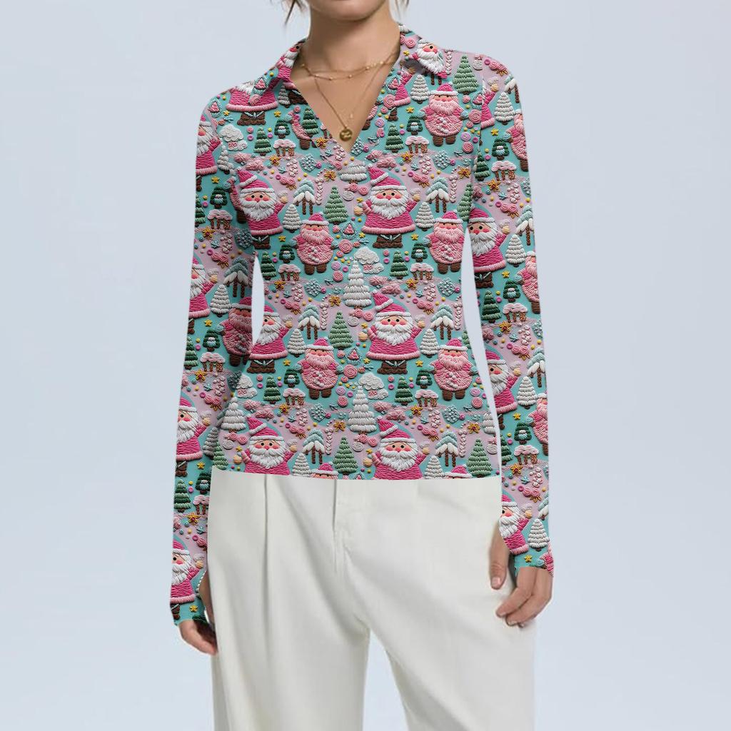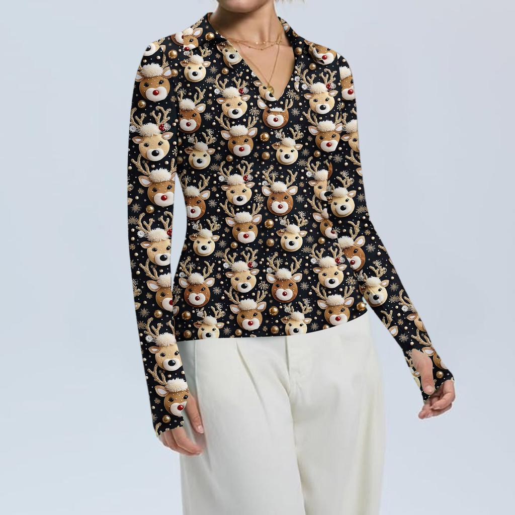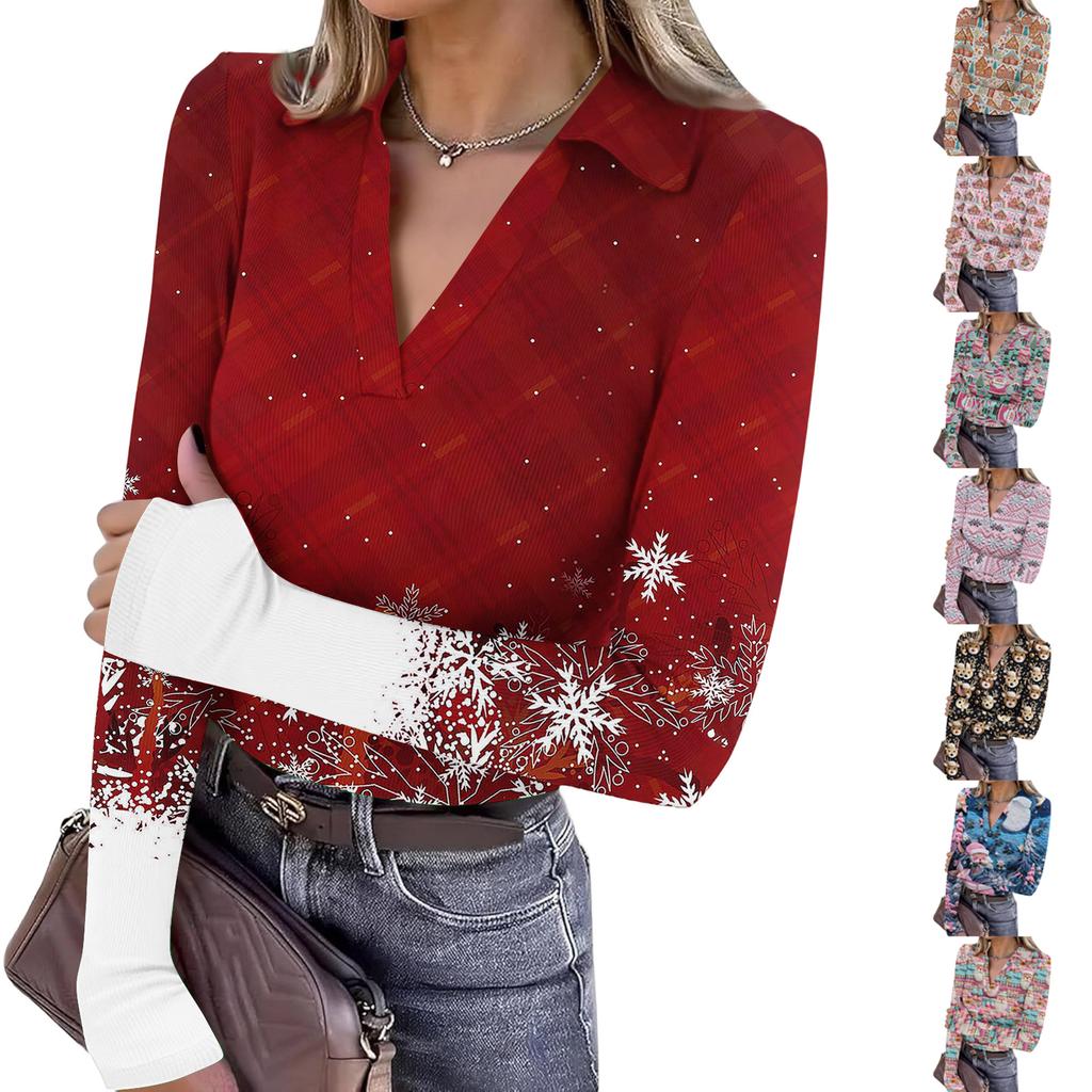 Женская модная повседневная блузка с V-образным вырезом, длинными рукавами и принтом на рождественскую тематику, застегивающаяся на пуговицы