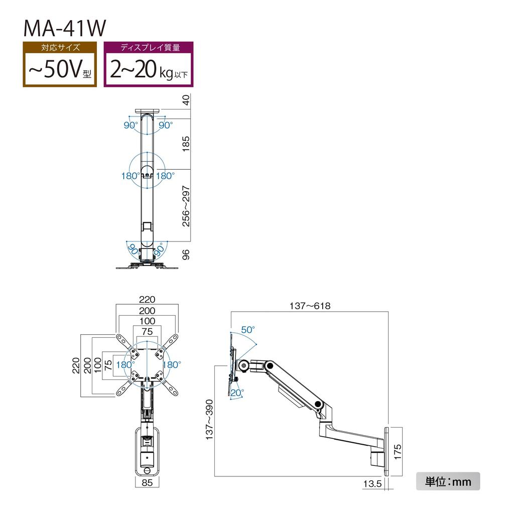 Hayami Kogyo Монитор VESA Одинарные Кронштейны до Мониторов MA-41W Кронштейн, Совместимый, Настенный, Тип, 50-дюймовый