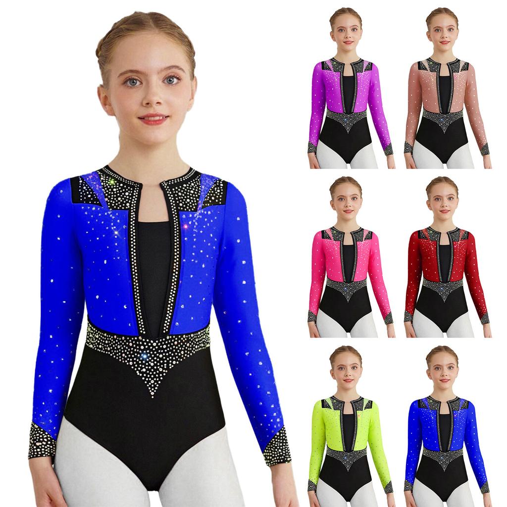 Гимнастический купальник для девочек с длинным рукавом, с вырезом-капелькой на спине, блестящими стразами, боди для фигурного катания