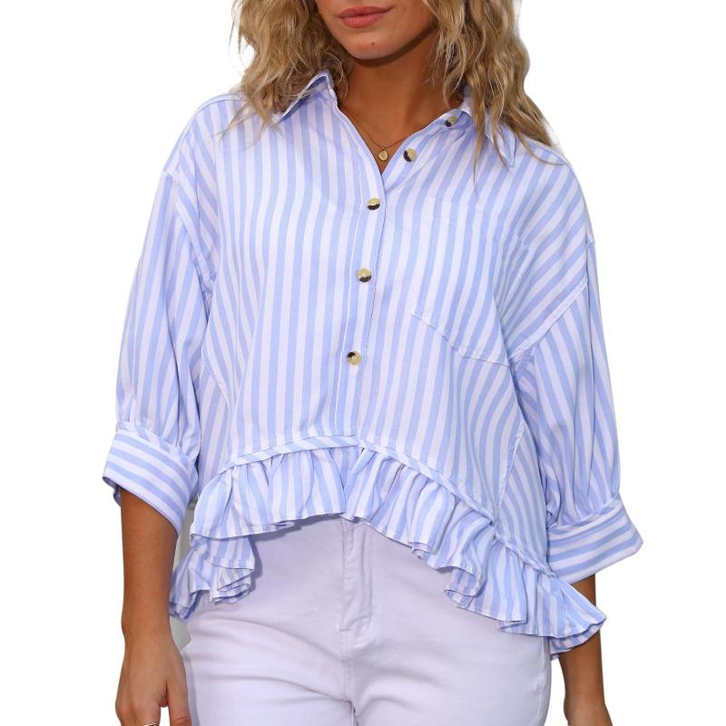 Женская мода Повседневная полосатая рубашка с кружевной отделкой по низу, свободного кроя, с рукавом три четверти