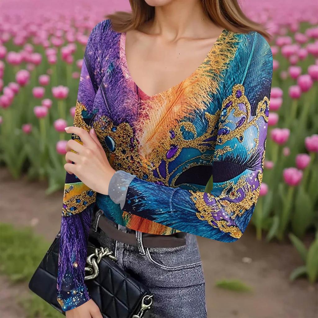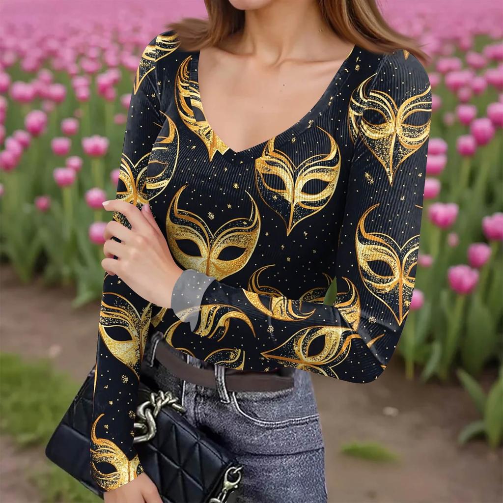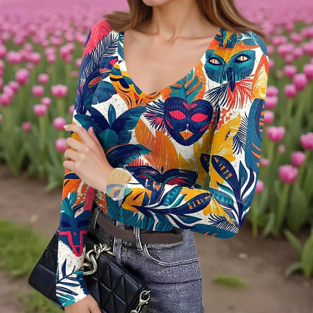 Женская зимняя приталенная футболка-базовый слой, модный принт, V-образный вырез, пуловер, топ с длинным рукавом