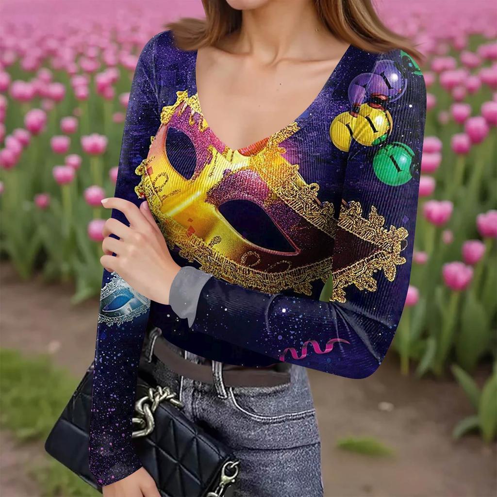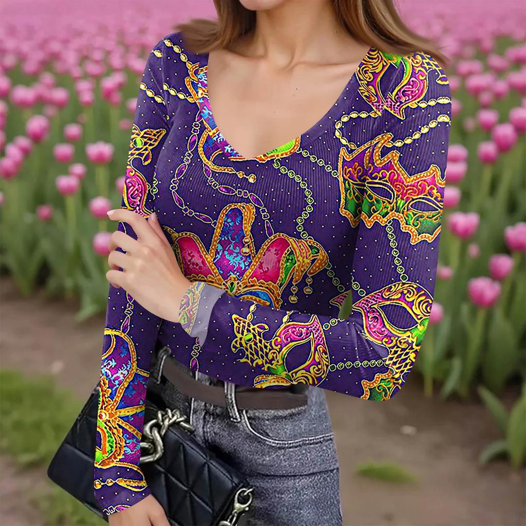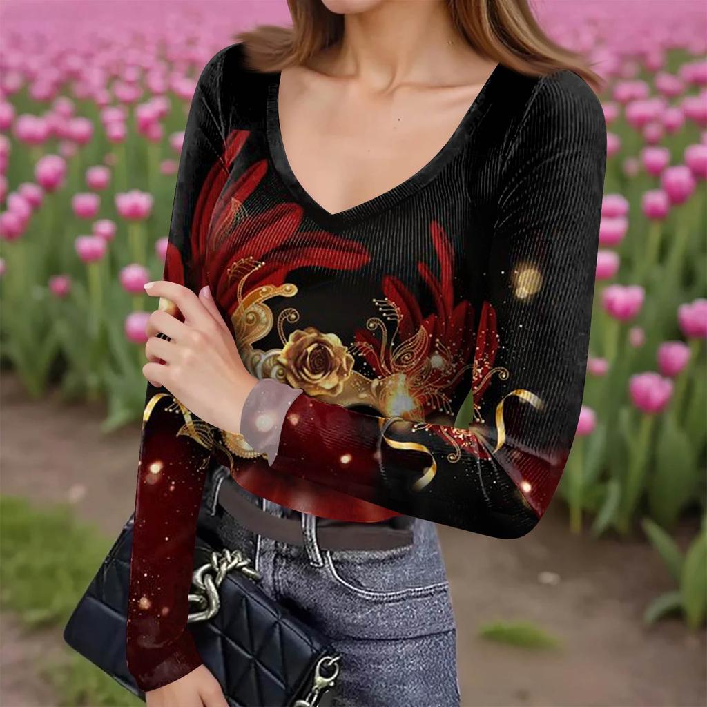 Женская зимняя приталенная футболка-базовый слой, модный принт, V-образный вырез, пуловер, топ с длинным рукавом