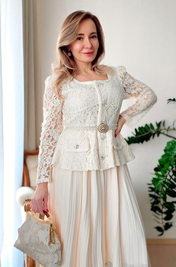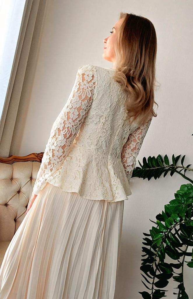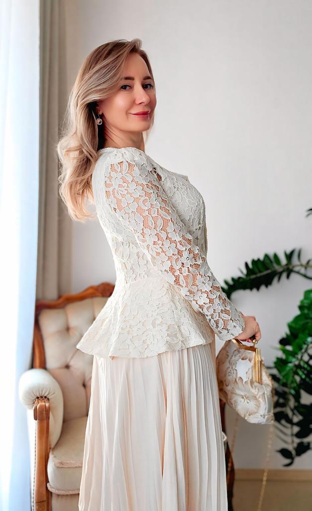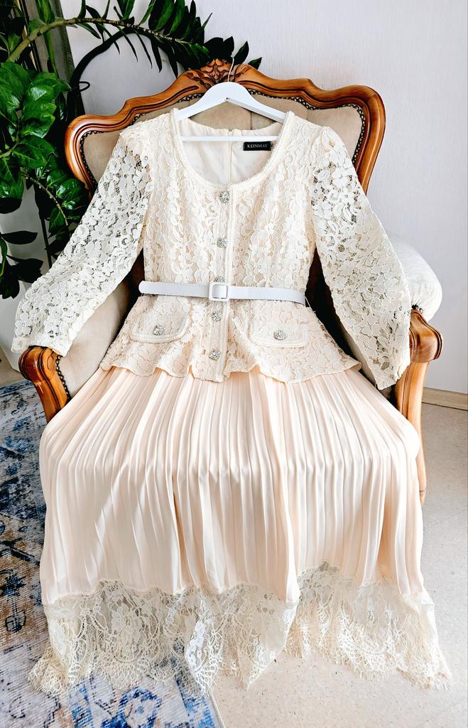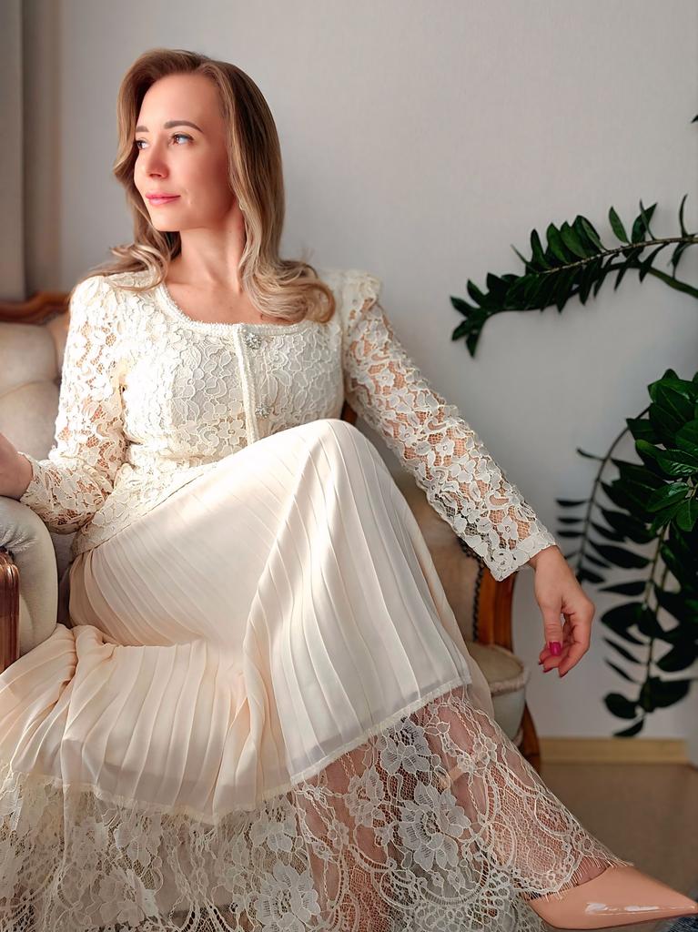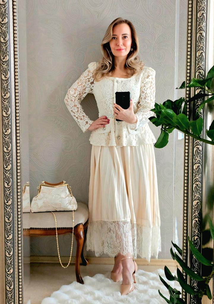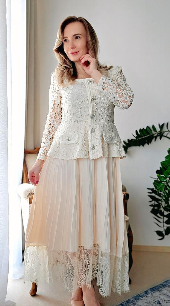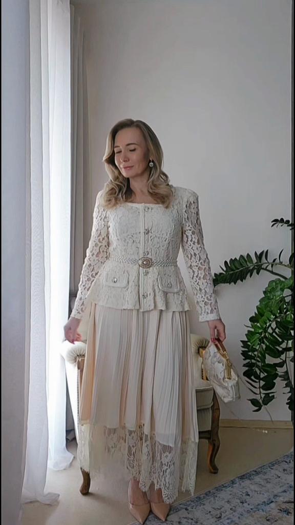 Шикарное платье для особого случая 🤍 Все детали смотрите на видео 📽 Три расцветки Размер S до 2XL Мои параметры 93-72-99см, рост 156см, на мне размер XL. Платье село идеально 👌 Замеры размера XL: Грудь 100 см, талия 82 см, бёдра 140 см по подкладу, ширина плеч 40 см, длина рукавов 62 см, общая длина по спинке 120 см. Очень красивое платье. Смотрится очень романтично и элегантно. Красивое, приятное на теле кружево в верхней части, на подкладе в области груди. Кружево не эластичное. Воздушная юбочка плиссировка с ажурным обрамлением на подкладе из нежного, не эластичного полиэстера ( я бы его немного укоротила, чтобы при движеннии не выглядывал из под полупрозрачного шифона. Юбка с подкладом немного электризуется, но не критично....Антистатик в помощь. Баска прекрасно прикроет небольшой животик и сделала красивую талию. Карманчика-обманчика. Красивые декоративные пуговицы с камнями. На спинке скрытая молния до талии. В комплекте идёт белый ремень, но мне больше нравится с моим жемчужным 😉 Цвет: нежный абрикос 🍑 Качество пошива аккуратное, но есть кое где пару ниток, но не притично. В целом отличное соотношение цены и качества. В таком платье можно хоть в театр, хоть на свадьбу 🙌 Мне очень нравится 🤗 Все ссылки на вещи из обзора и многое другое вы найдёте в моём Телеграм-канале 🔎 Инга Эйбауер Ваша Инга