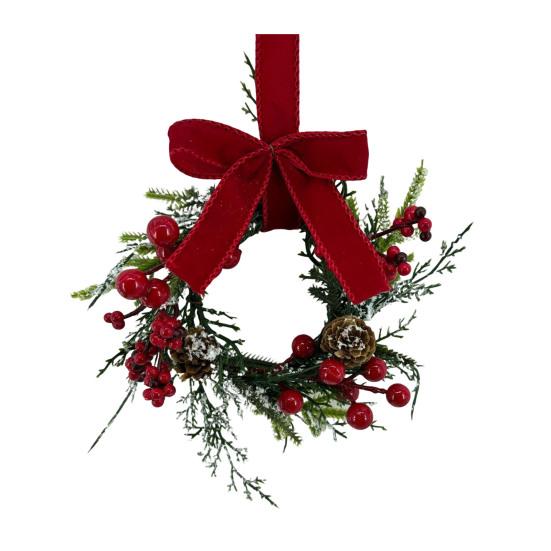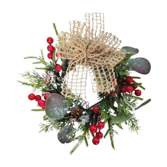 Универсальные декоративные элементы: Украшенные очаровательными бантами, эти мини-венки в стиле фермерского дома излучают нежное очарование благодаря акцентам из сосновых иголок, ягод и сосновых шишек, что делает их универсальными для украшения различных помещений и открытых пространств.