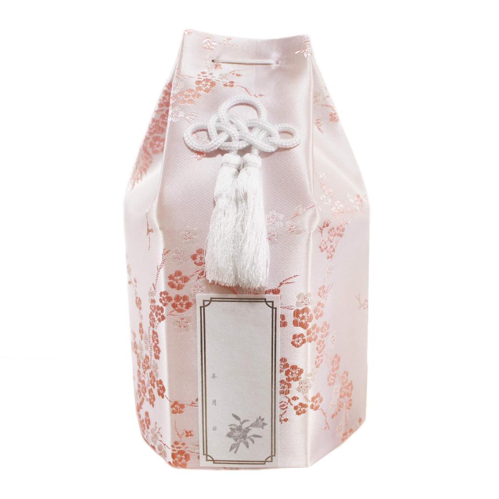 Buddhist urn, plum blossom design, silk, 3.5 inches, pink, with posthumous Buddhist name sticker, urn cover only