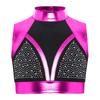 Girls Shiny Dance Top Mock Neck Sleeveless Cutout Back Rhinestones Color Block Metallic Crop Performance Outfit