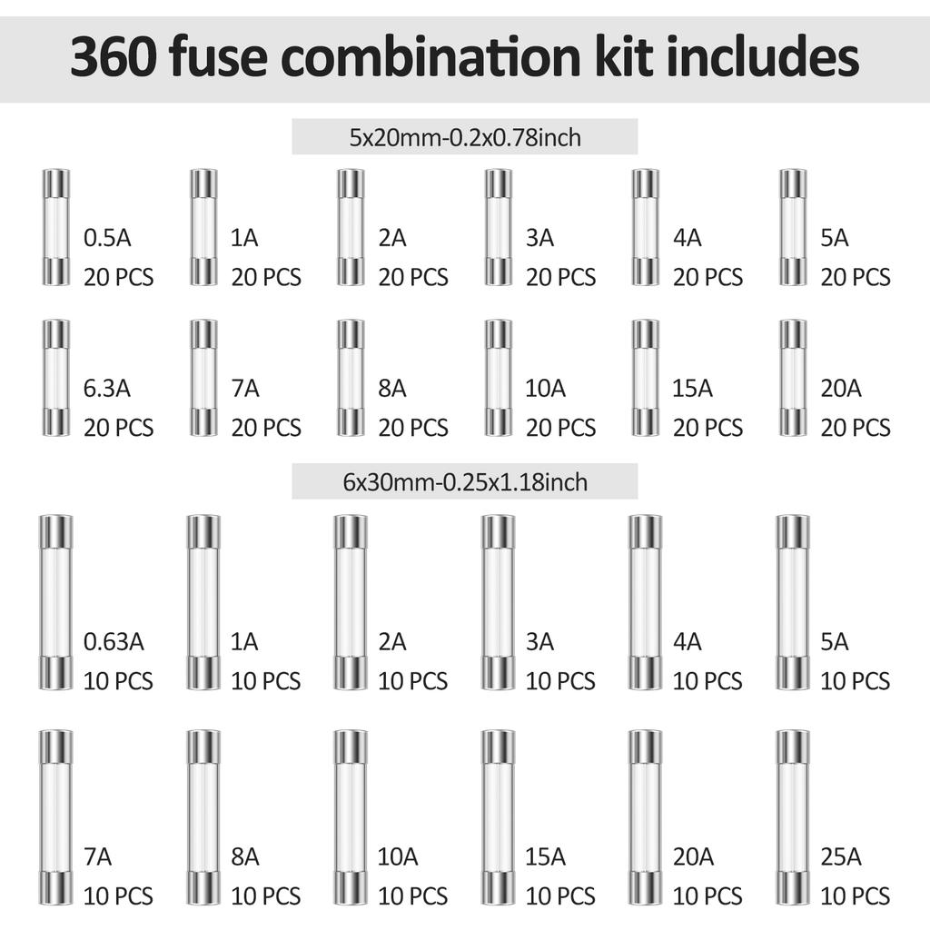 360Pcs Fast Blow Glass Fuses Assortment Kit 24 Values Auto Fuses Assortment Kit 5x20mm 6x30mm Glass Tube Fuses for Power Socket