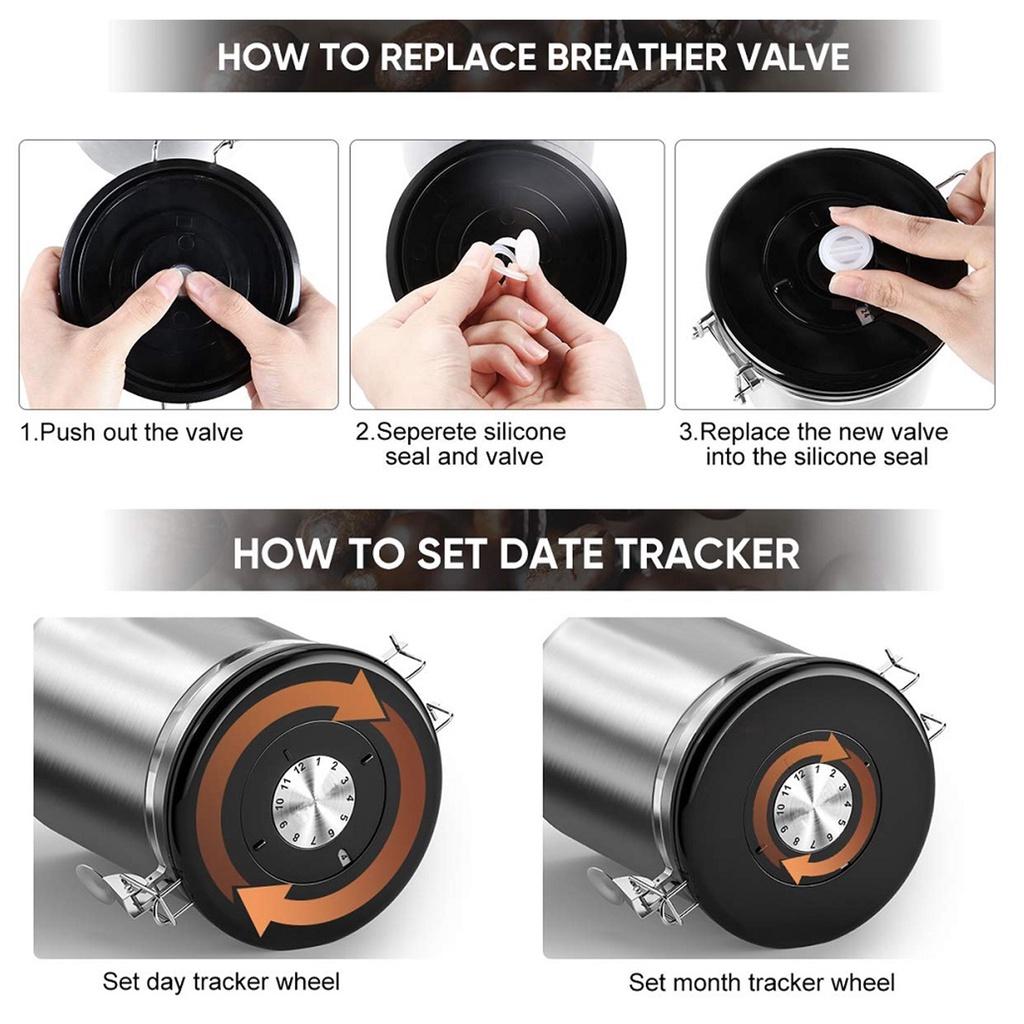 -【Дизайн колеса даты】: Наша крышка для хранения кофейных зерен также имеет временную шкалу посередине, чтобы помочь вам отслеживать, когда вы кладете свои кофейные зерна или гущу, поэтому вам не нужно искать лист бумаги, чтобы отслеживать их или иным образом отслеживать их. . Внутренний круг устанавливает месяц, а внешний круг устанавливает день.