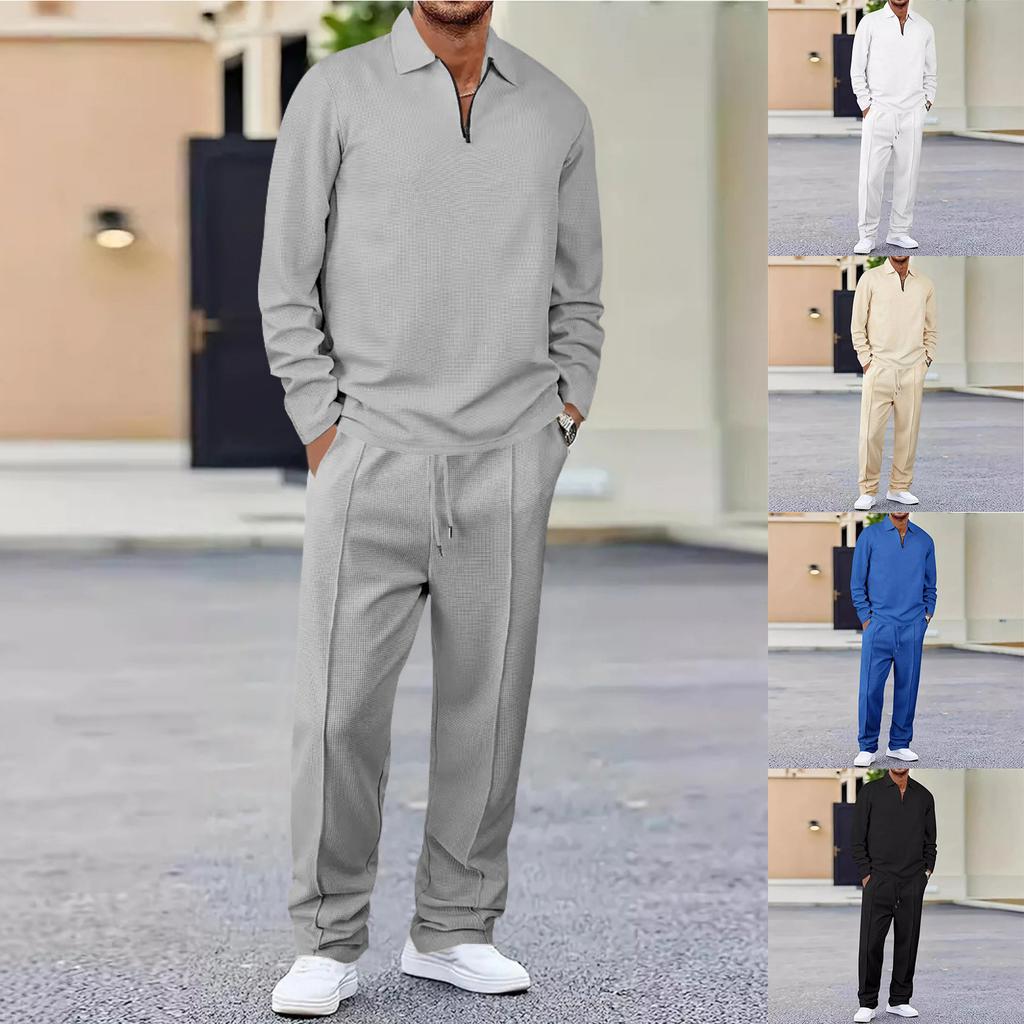 Мужской однотонный повседневный спортивный костюм, полосатая рубашка с длинным рукавом, топ с квадратным вырезом на молнии, комплект брюк на кулиске