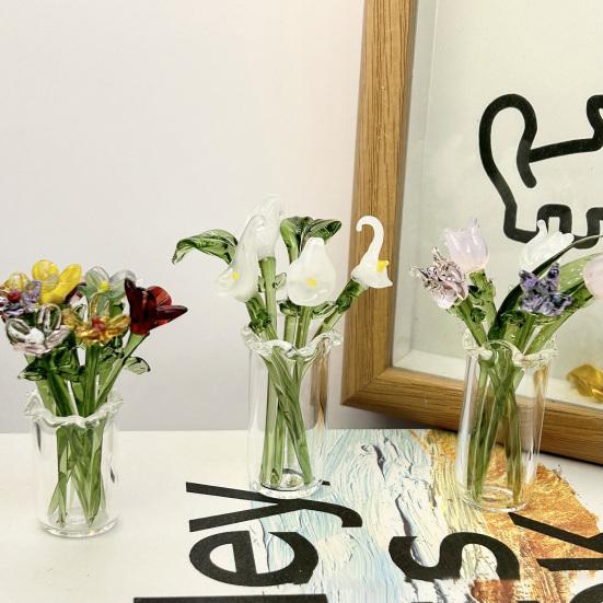 Универсальные варианты стиля: Доступные в различных стилях и цветах, эти стеклянные цветы позволяют вам настроить вашу букетную композицию или без труда дополнить любую вазу.. Их элегантный дизайн органично вписывается в разнообразные интерьерные темы, от современного минимализма до классической изысканности.