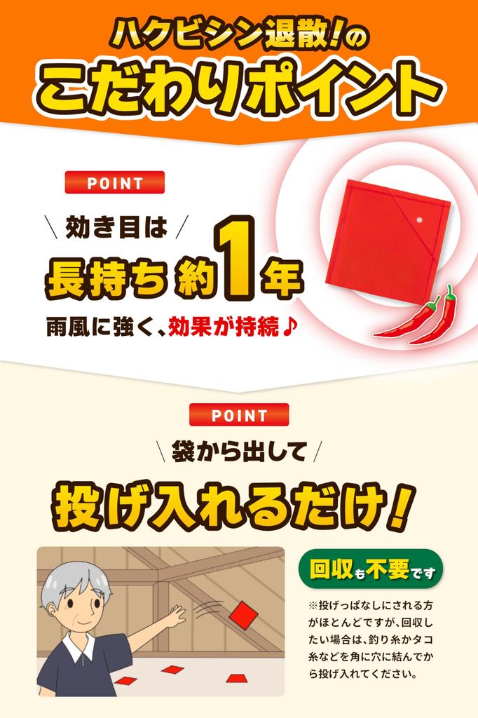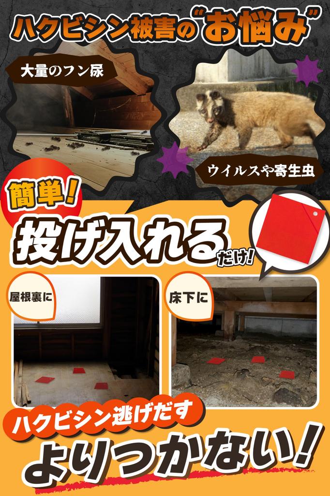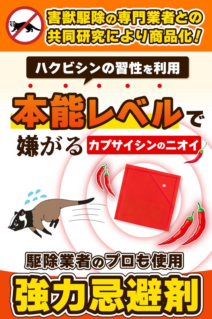 [Recommended by pest control professionals] The capsaicin smell, which civets instinctively hate, drives them away. Even civets with an excellent sense of smell can't tolerate the strong stimuli. This repellent was developed in collaboration with pest control professionals, taking advantage of civets' instincts to break their attachment to a specific area.