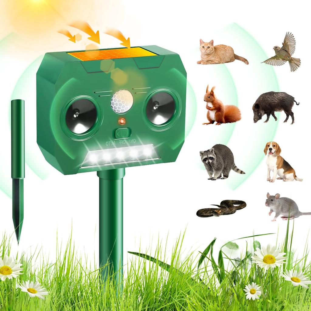 Introducing the ultimate eco-friendly solution to protect your garden and crops from those pesky creatures! 🌟 This solar-powered ultrasonic animal repellent lets you say goodbye to ineffective nets and dangerous chemicals! 🎯 Powerfully protect your precious space from birds, deer, wild boars, cats, dogs, rats, and other nuisances. ⚡ Dual attack for intelligent and gentle repelling! 🔊 Inaudible ultrasonic waves and 💡 Nighttime flashing strobe light teach animals to avoid danger, driving them away humanely and thoroughly! 🌿 This harmless design is friendly to your pets and the surrounding ecosystem. 🌞 Powered by the sun, it keeps your electricity bills down! The high-performance solar panel charges even with minimal sunlight! ☔ Even on cloudy or rainy days, you can rest assured that it will operate continuously for up to 5 days on a full charge. 🔋 Completely zero electricity bill! Free from the hassle of wiring, you can freely install it anywhere in your garden or field. 💰 Reduces running costs, making it a sustainable choice that is kind to both the earth and your household budget. 💧 Tough enough to withstand any weather