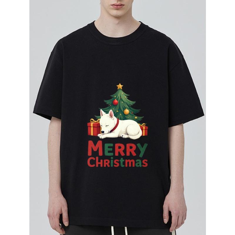 Рождественская футболка Черная Белая Собака и Рождественская елка с подарками Принт Счастливого Рождества Праздничная вечеринка Повседневная одежда