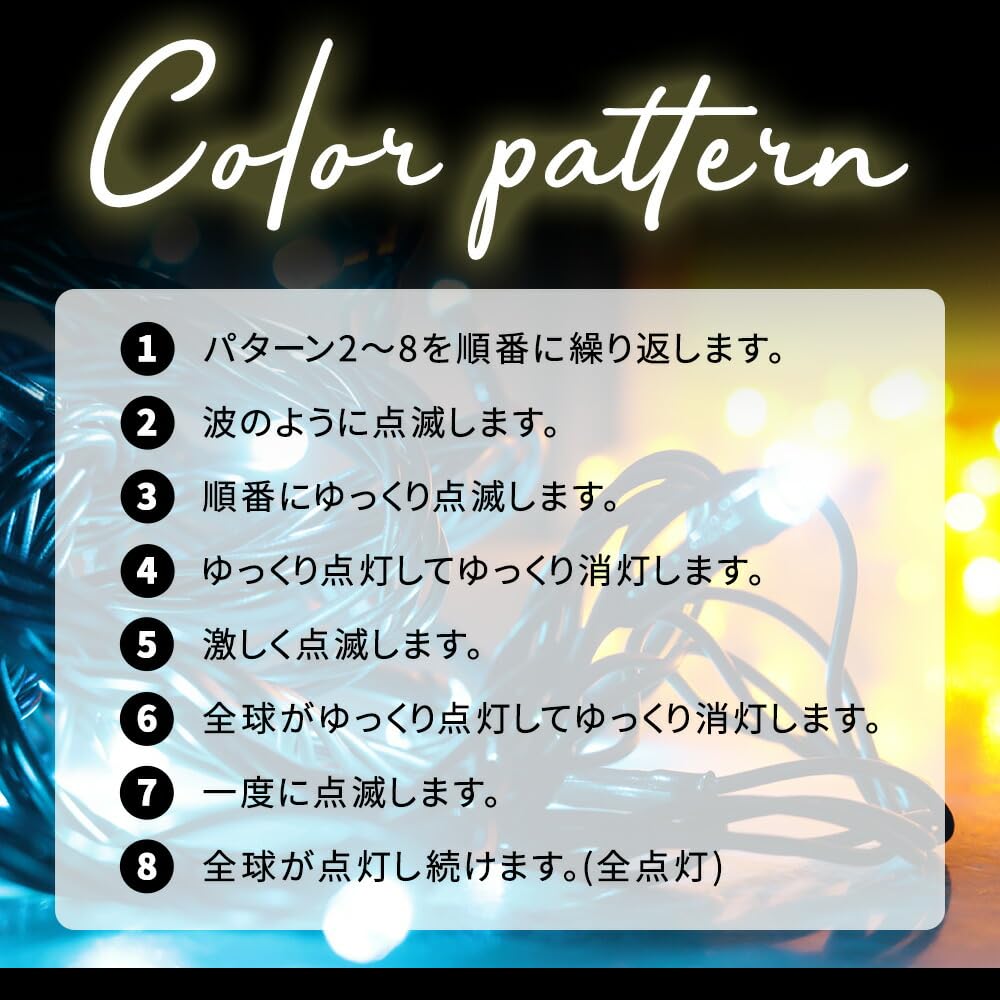 [Equipped with 8 lighting patterns] Equipped with 8 modes that can be easily switched with the controller. Choose the lighting expression that suits the scene, such as wave-like flashing light, slow fading light, or full lighting. Create different atmospheres for each season, such as Christmas, birthdays, weddings, and store decorations. Operation is simple with just one button, making it easy for anyone to use.