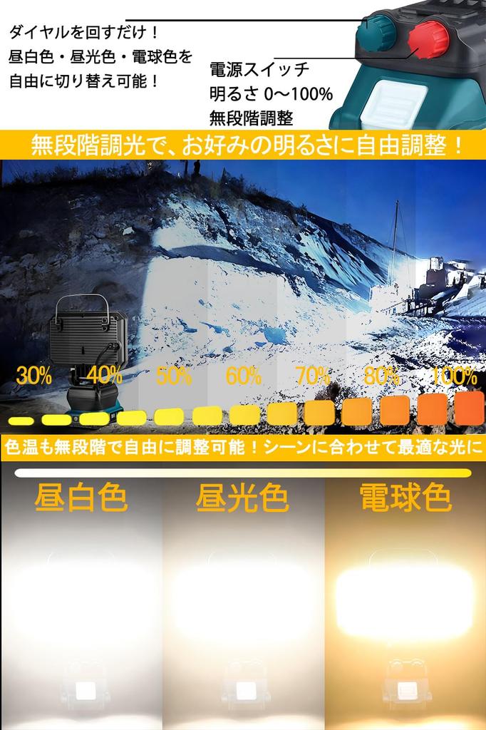 [Бесступенчатая регулировка яркости/цветовой температуры] Этот прожектор позволяет регулировать яркость и цветовую температуру (от 2700K теплый белый до 3000K дневной белый до 6500K дневной белый) бесступенчато. Эта гибкость позволяет мгновенно создать оптимальное освещение для снижения усталости глаз, будь то свет для привлечения рыбы для ночной рыбалки, когда вам нужна расслабляющая атмосфера, или для точной работы, требующей концентрации, в зависимости от времени суток или погоды.. От точной работы до освещения широкой площади, вы можете мгновенно выбрать свет, который лучше всего соответствует вашим потребностям в любое время.
