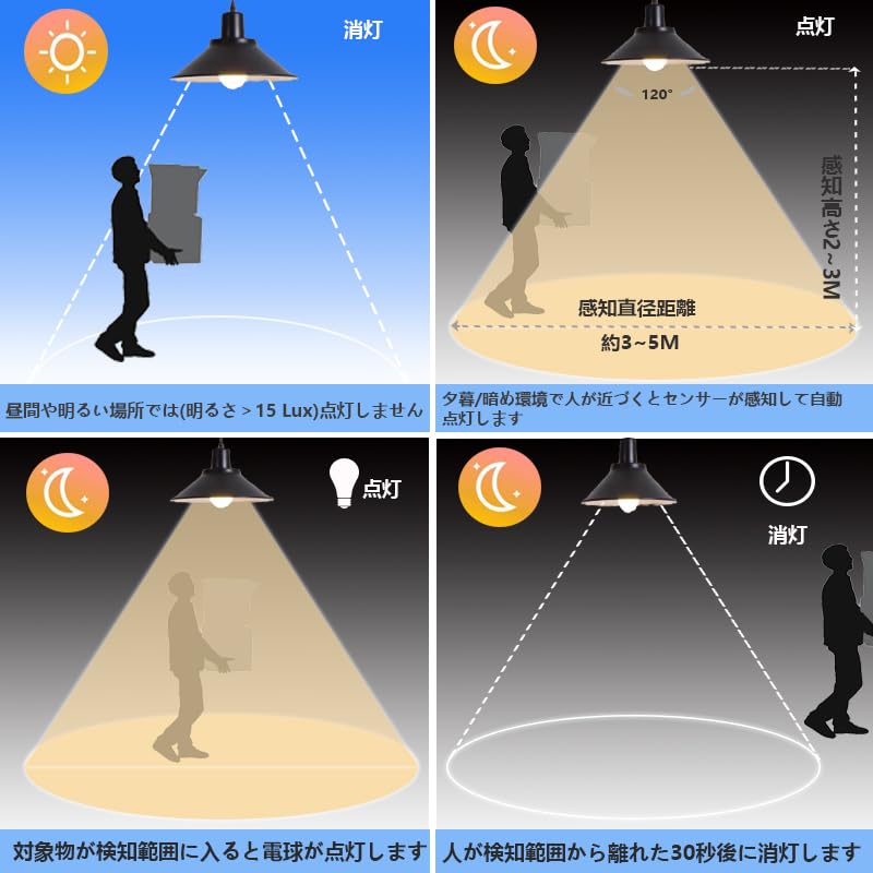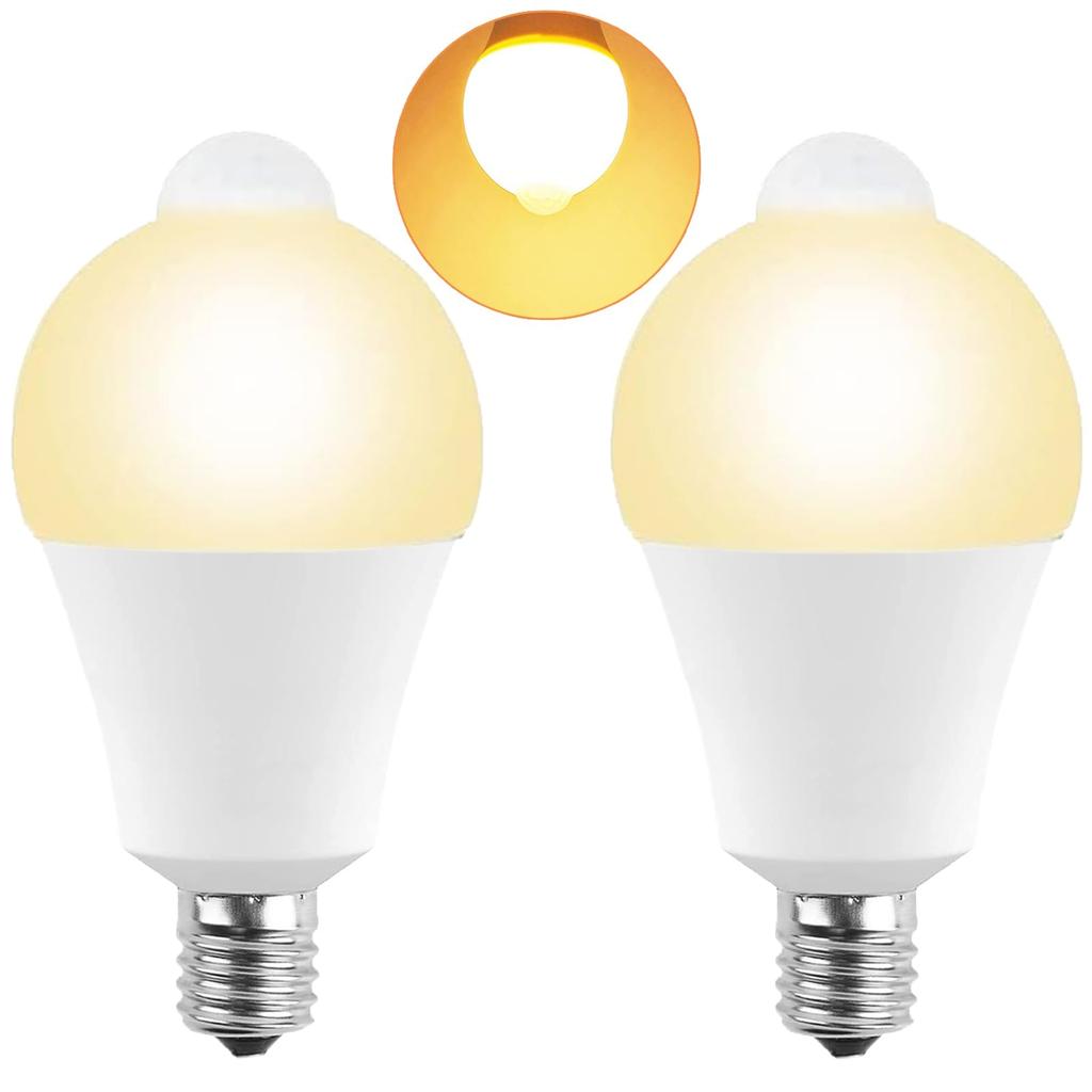 [Product Specifications] ● E17 LED bulb with motion and light sensor function ● Compatible base: E17 ● Light distribution: Downward type ● Sensing range: 3-5m, height 2-3m ● Sensing angle: Approximately 120° ● Input voltage: AC 100V ● Rated power consumption: 7W (equivalent to a 60W bulb) ● Total luminous flux: 800LM ● Color temperature: Incandescent color 3000K ● CRI: ≥80RA ● Dimming function: No ● Package: 2 pieces ● Compatible with open fixtures ● Working environment: Indoor and outdoor use [Note: Please check the product's base, type, length, color temperature, etc. before purchasing.]