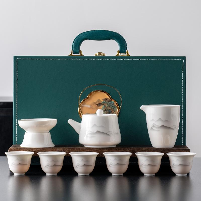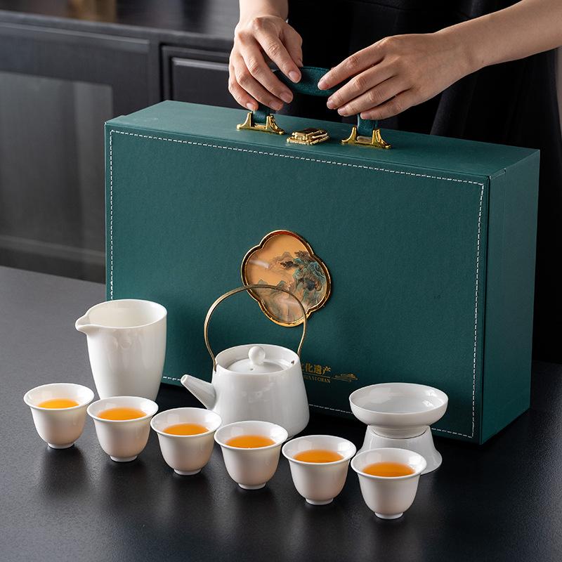 Легкий роскошный нефритовый белый фарфоровый чайный сервиз для кунг-фу, полный набор, офисные высококлассные бизнес-подарки, подарочная коробка