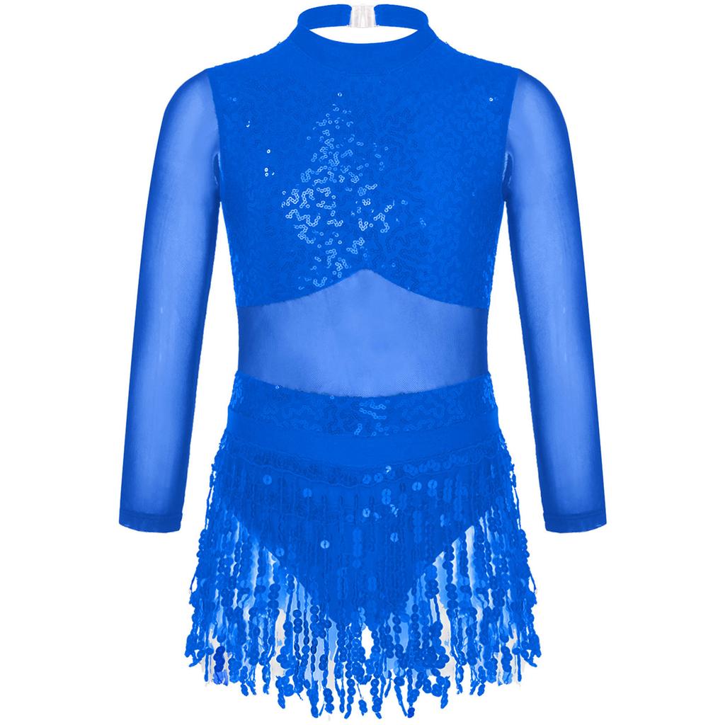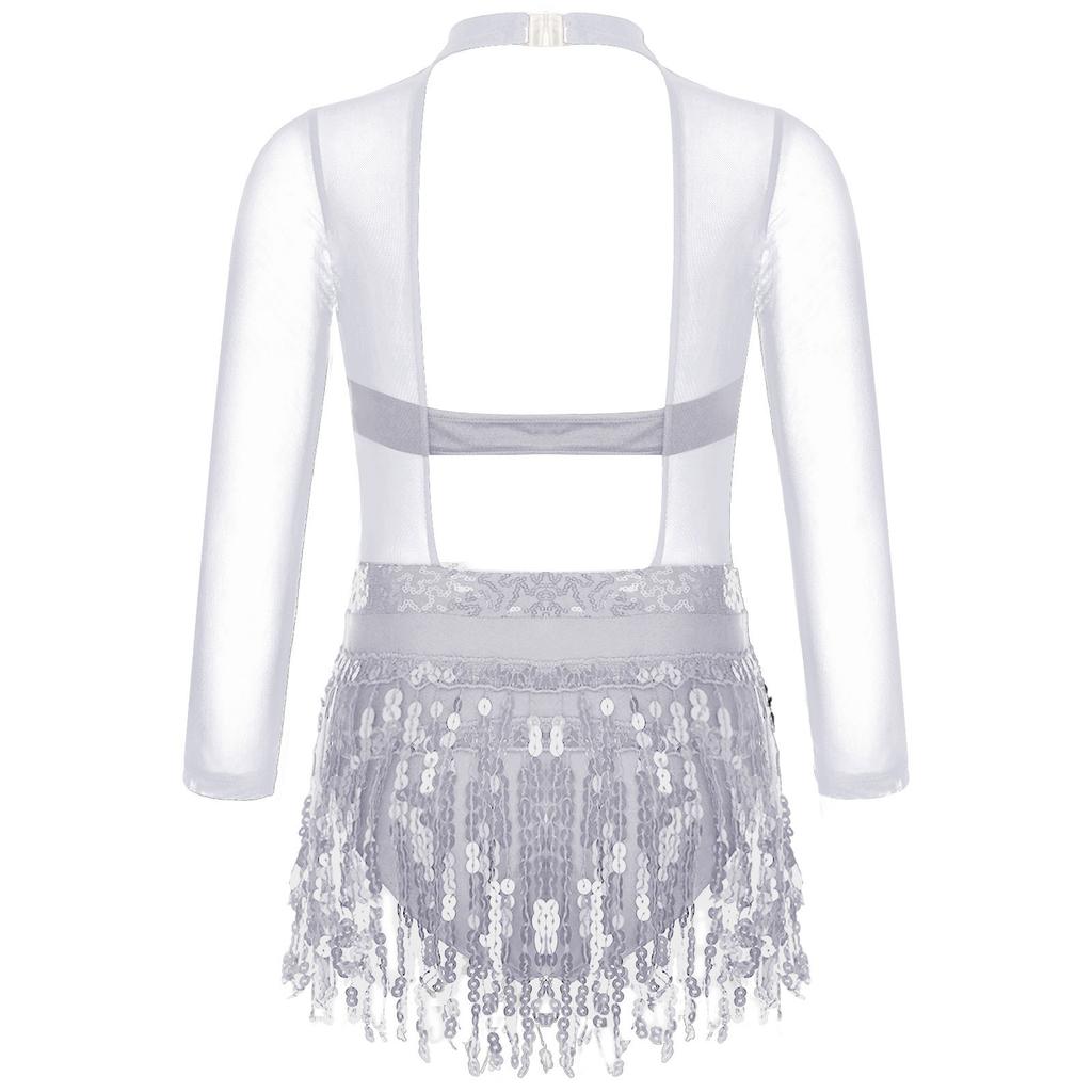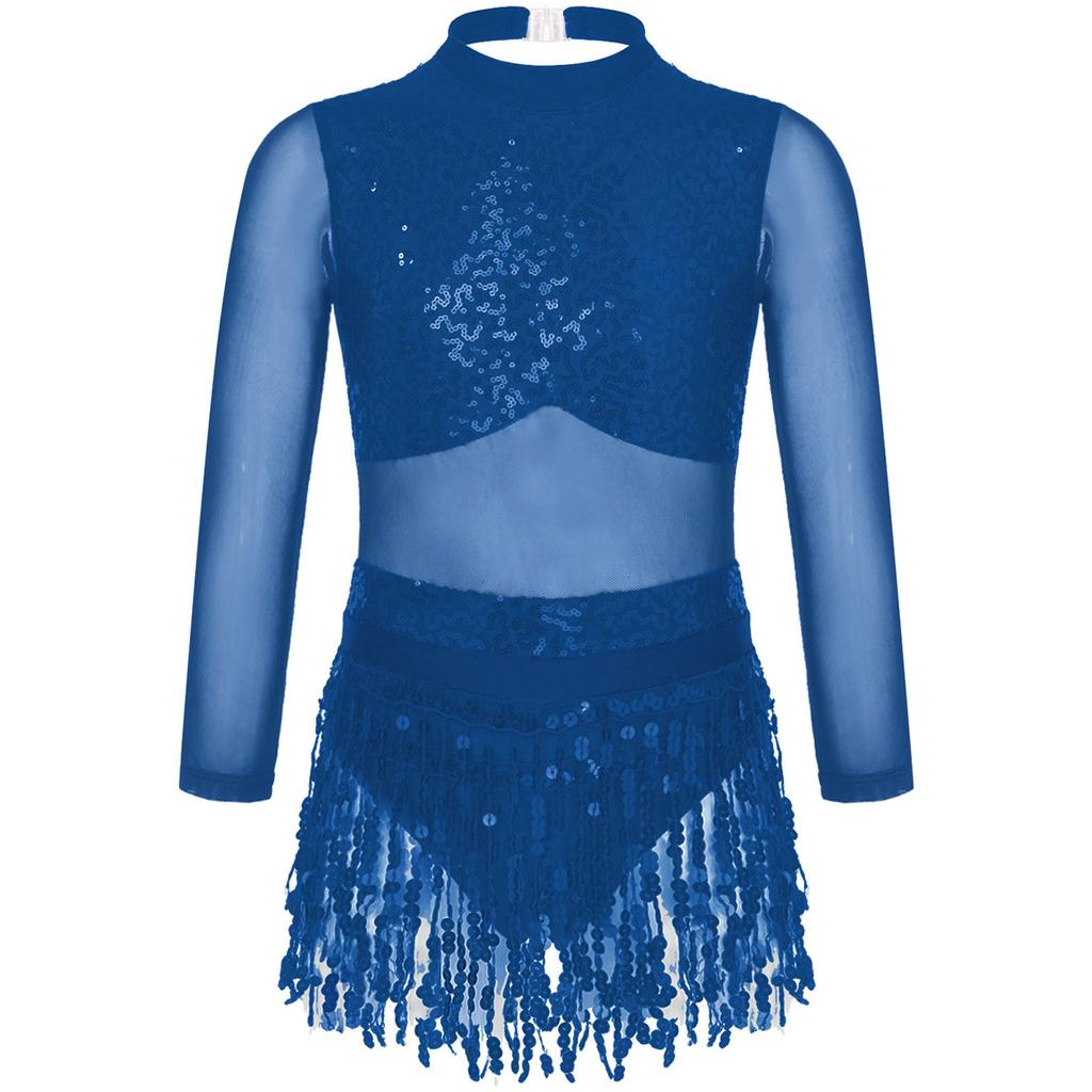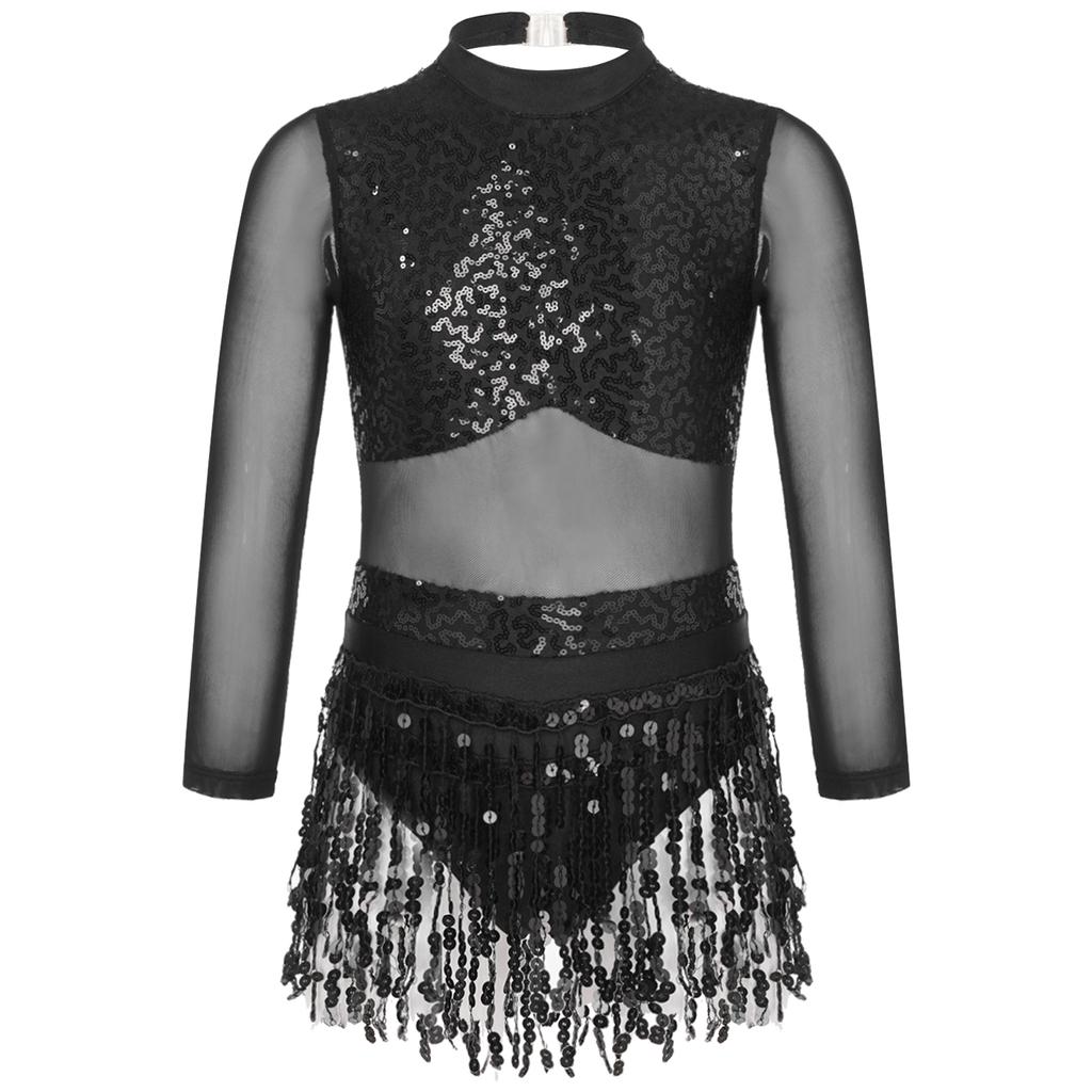 Girls Dance Costume Mesh Long Sleeve Shiny Sequins Hollow Back Patchwork Style Tassel Dress