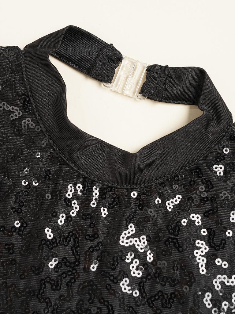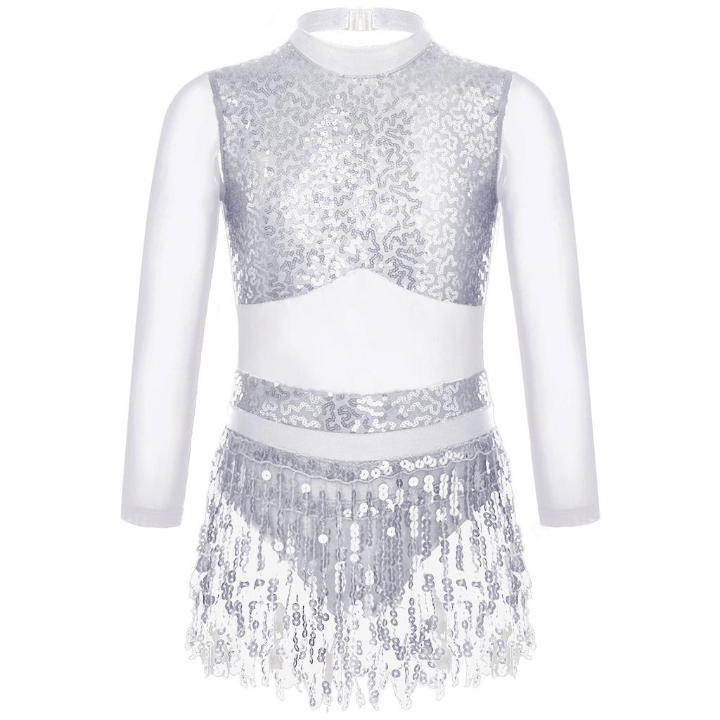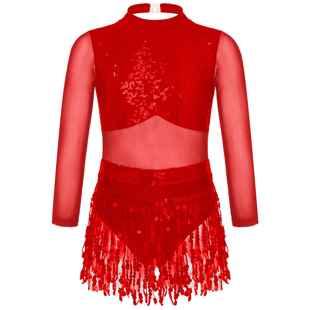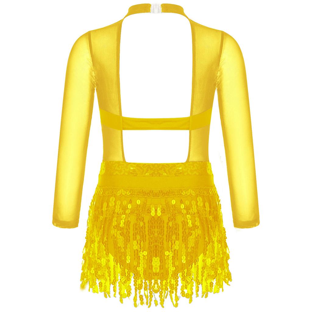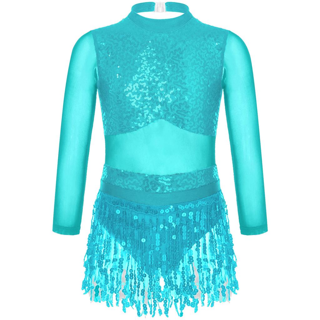 Girls Dance Costume Mesh Long Sleeve Shiny Sequins Hollow Back Patchwork Style Tassel Dress