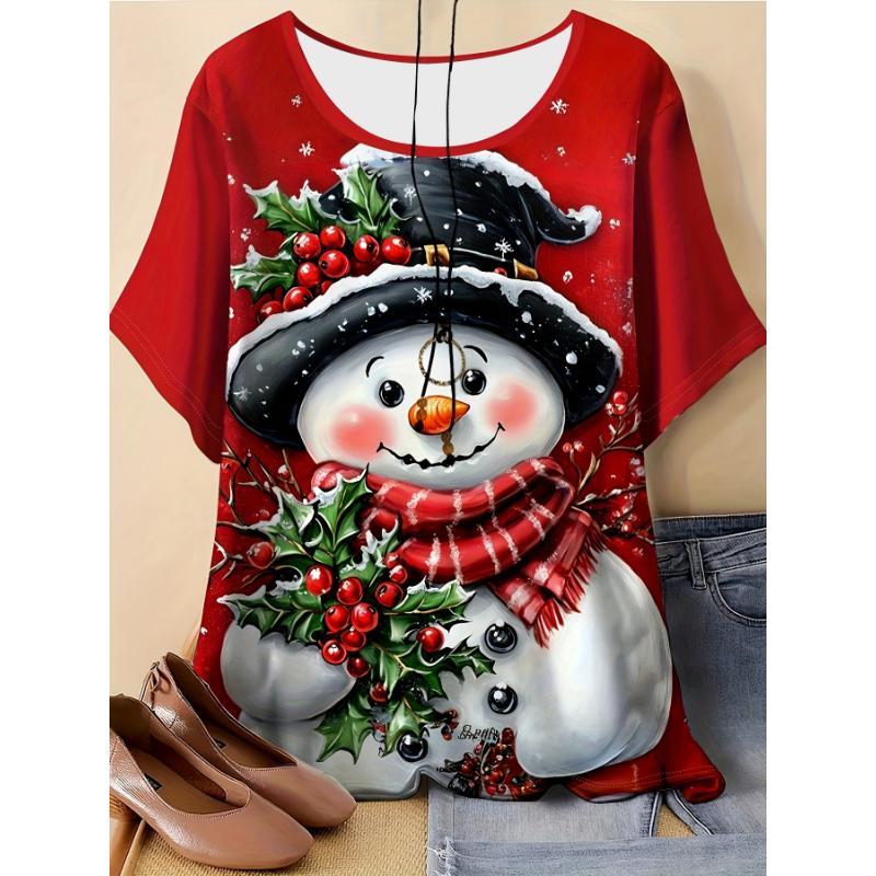 Элегантный красный рождественский топ с принтом снеговика, женская футболка с коротким рукавом, повседневная зимняя и летняя блузка оверсайз в стиле Y2k, женская одежда
