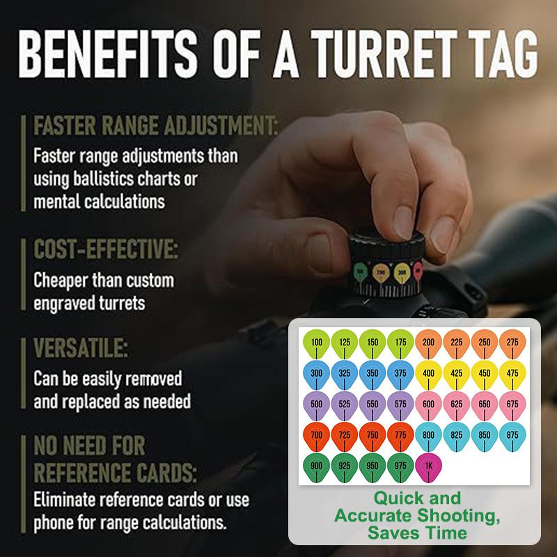 1,Метки турелей с быстрой регулировкой:Добивайтесь быстрых и точных выстрелов на дальние дистанции с этими наклейками для турелей. Разработанные для бесперебойной работы с вашей карточкой данных о предыдущих стрельбах или карточкой дальности, они позволяют вам мгновенно подобрать дистанцию до вашей цели, совмещая соответствующую предварительно размеченную наклейку на барабане вашего прицела.. Никаких догадок — просто приклей, набери и снимай.