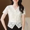 Темпераментная блузка с V-образным вырезом и короткими рукавами, кружевная, модный ажурный топ для женщин на лето, новая приталенная и универсальная блузка