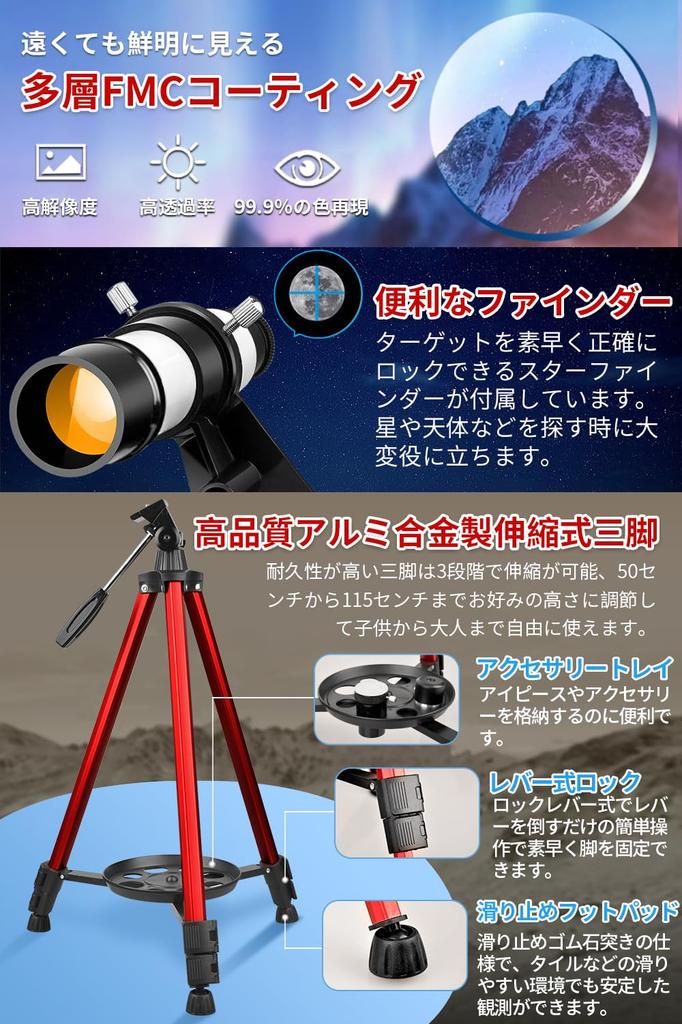 ✨[Включает телескопический штатив из алюминиевого сплава, лунный фильтр и адаптер для фотосъемки на смартфон] Штатив астрономического телескопа Coretu изготовлен из высококачественного алюминиевого сплава, что обеспечивает долговечность и долгий срок службы. Его противоскользящие резиновые ножки обеспечивают устойчивую съемку даже на скользких поверхностях, таких как плитка.. Трехступенчатая телескопическая конструкция позволяет ему выдвигаться от сложенной длины 50 см до максимальной 115 см. Он разработан для долгосрочного использования по мере роста вашего ребенка и удобен и для взрослых.. Окуляр включает лунный фильтр, который уменьшает блики, часто возникающие при наблюдениях полной Луны, и делает детали лунной поверхности более четкими.. Это улучшает видимость, облегчая наблюдение за тонкими деталями.. Это также совместимо с фотографией на смартфон. Входящий в комплект адаптер для смартфона позволяет вам наслаждаться не только астрономическими наблюдениями, но и астрофотографией.. Поделитесь своими фотографиями с друзьями, загрузив их в социальные сети. Рекомендуется для учеников начальной и средней школы, а также для начинающих.