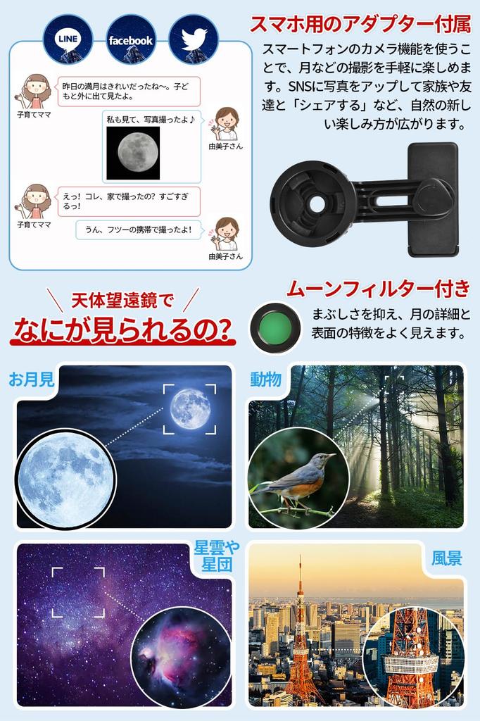 ✨[Включает лоток и надежную поддержку] Входящий в комплект лоток удобно хранит окуляры и аксессуары во время использования. [Комплектация] Труба телескопа, телескопический штатив из алюминиевого сплава, искатель, лоток, окуляры (К6мм/К10мм/К25мм), лунный фильтр, линза Барлоу, специальная пылезащитная крышка, зенитное зеркало, адаптер для смартфона, сумка для хранения, специальная коробка и японская инструкция по эксплуатации. [Гарантия] Мы стремимся к 100% высокому качеству и предлагаем гарантию при каждой покупке. Если у вас есть какие-либо вопросы или пожелания, пожалуйста, свяжитесь с нами через историю заказов Amazon.. *Пожалуйста, внимательно прочитайте руководство по эксплуатации перед использованием и полностью поймите его содержание перед использованием продукта.