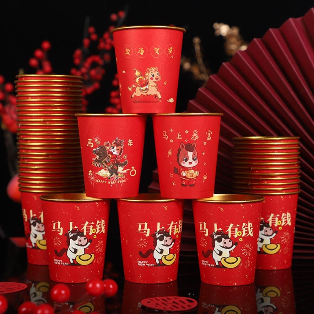 50pcs Horse Pattern 2026 Spring Festival Disposable Cup Gold Foil Drinking Tea Cup Family Dinner