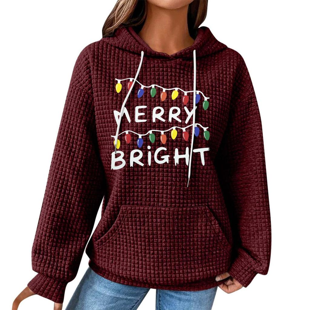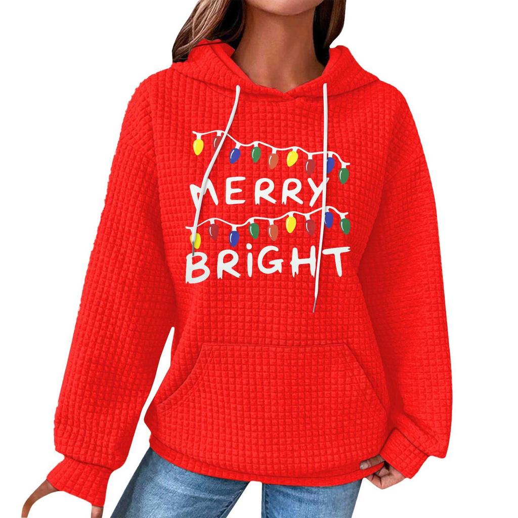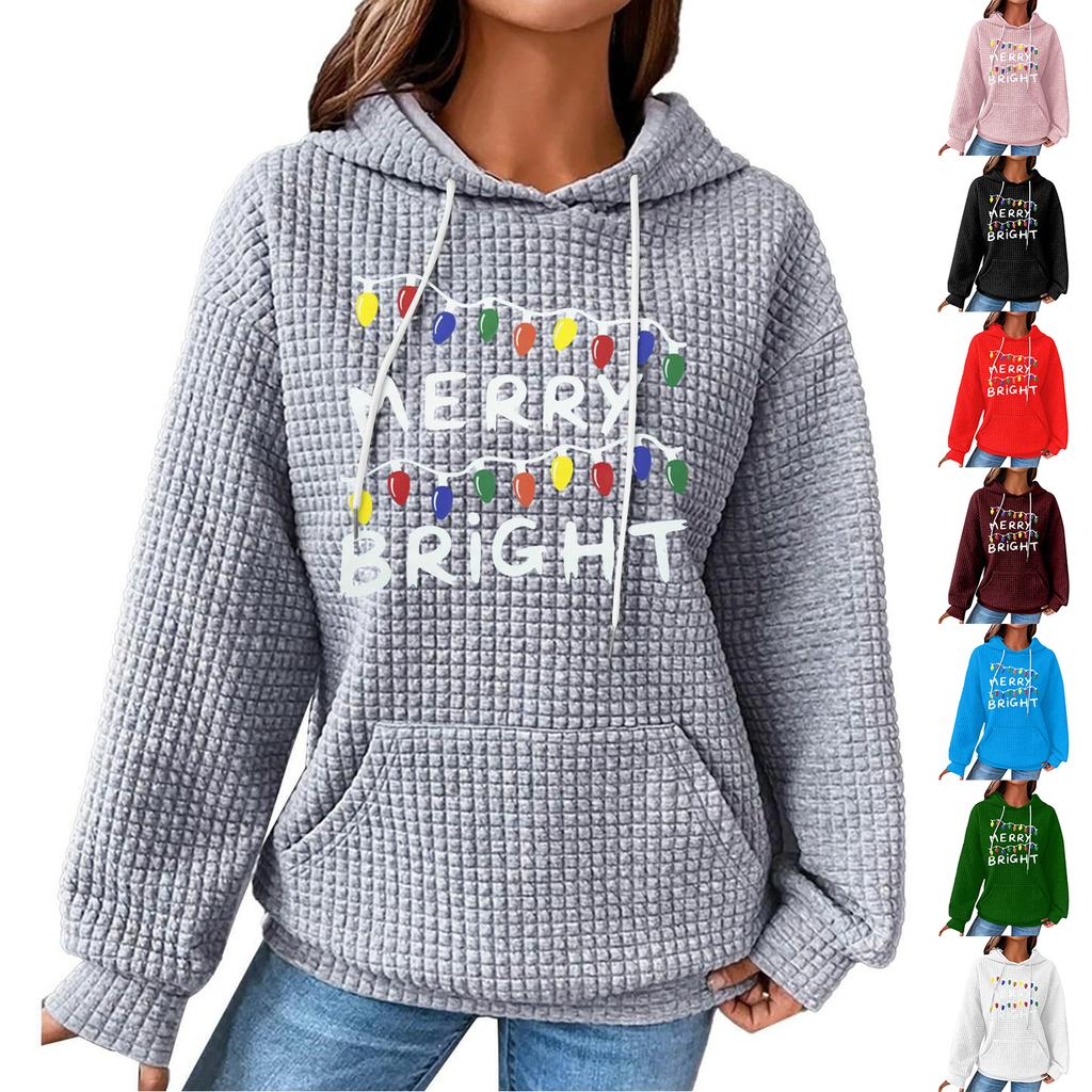 Женский модный свободный пуловер с капюшоном, длинными рукавами, клетчатый свитшот с кулиской, со спущенным плечом, карманом, рождественским принтом