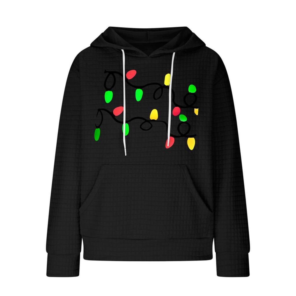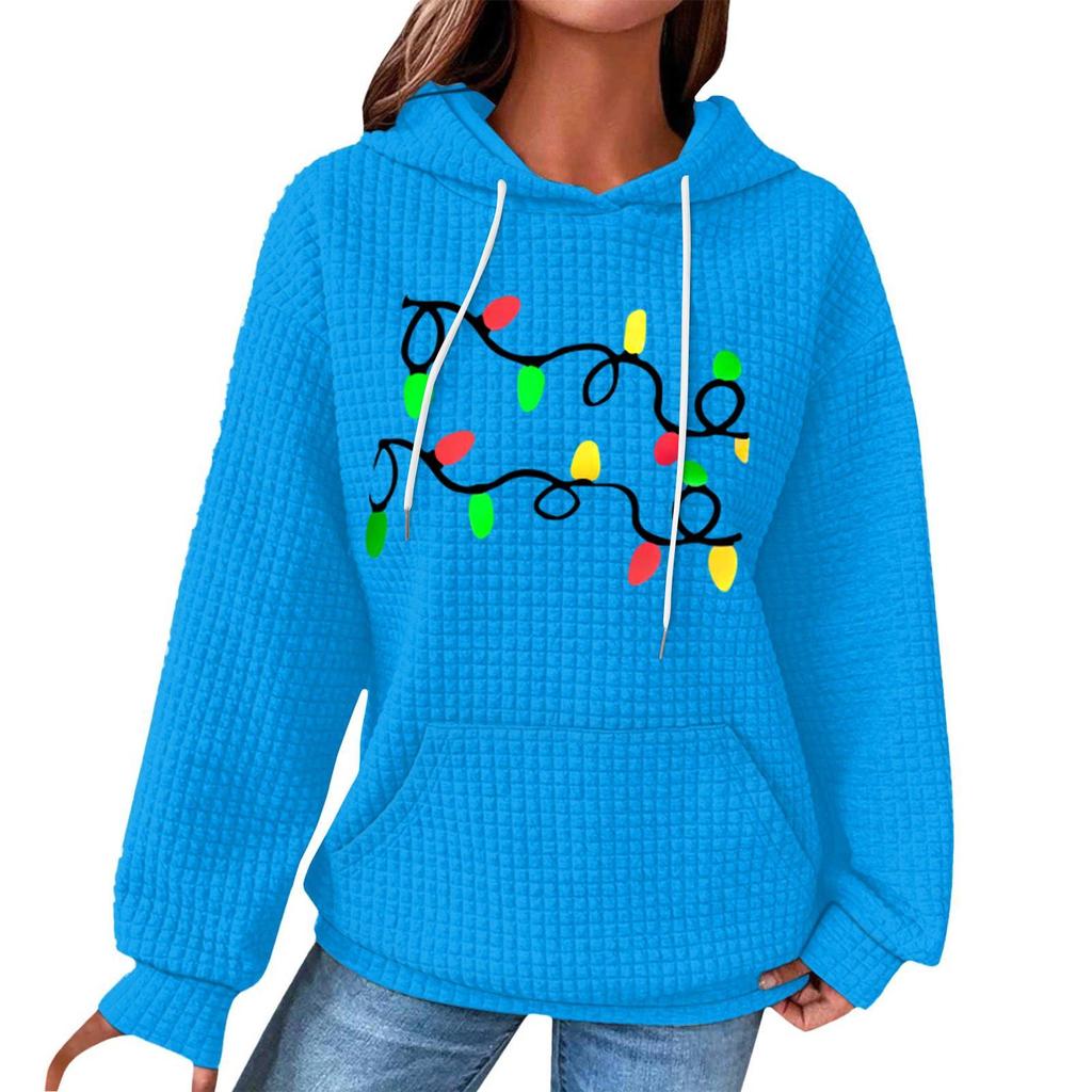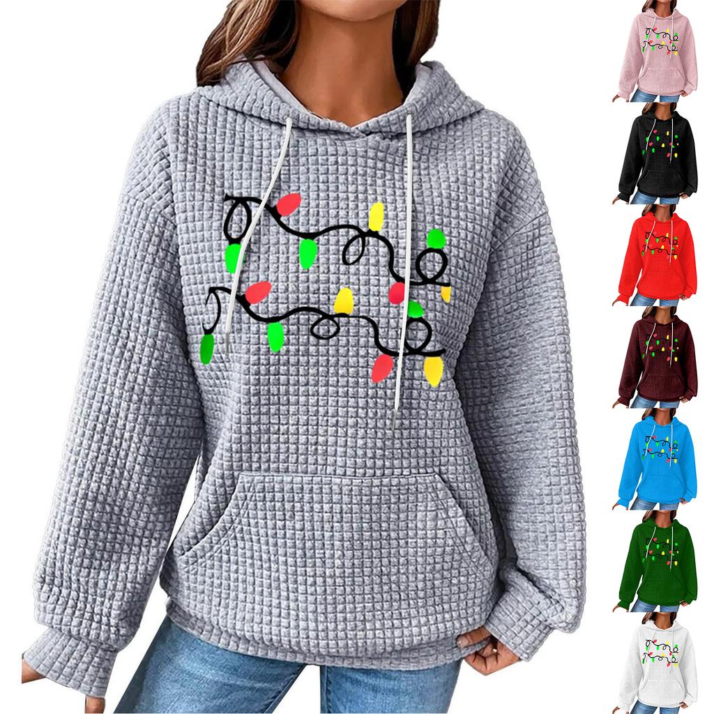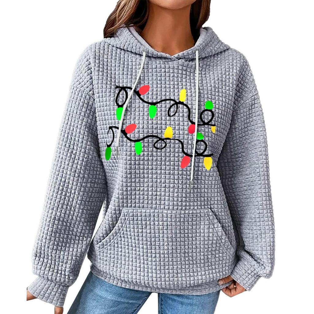 Женский модный свободный пуловер с капюшоном, длинными рукавами, клетчатый свитшот с кулиской, со спущенным плечом, карманом, рождественским принтом