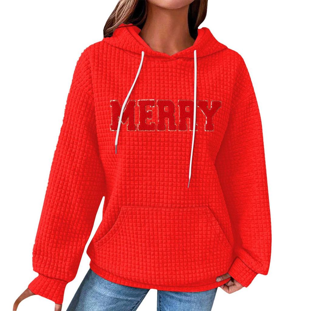 Женский модный свободный пуловер с капюшоном, длинными рукавами, клетчатый свитшот с кулиской, со спущенным плечом, карманом, рождественским принтом