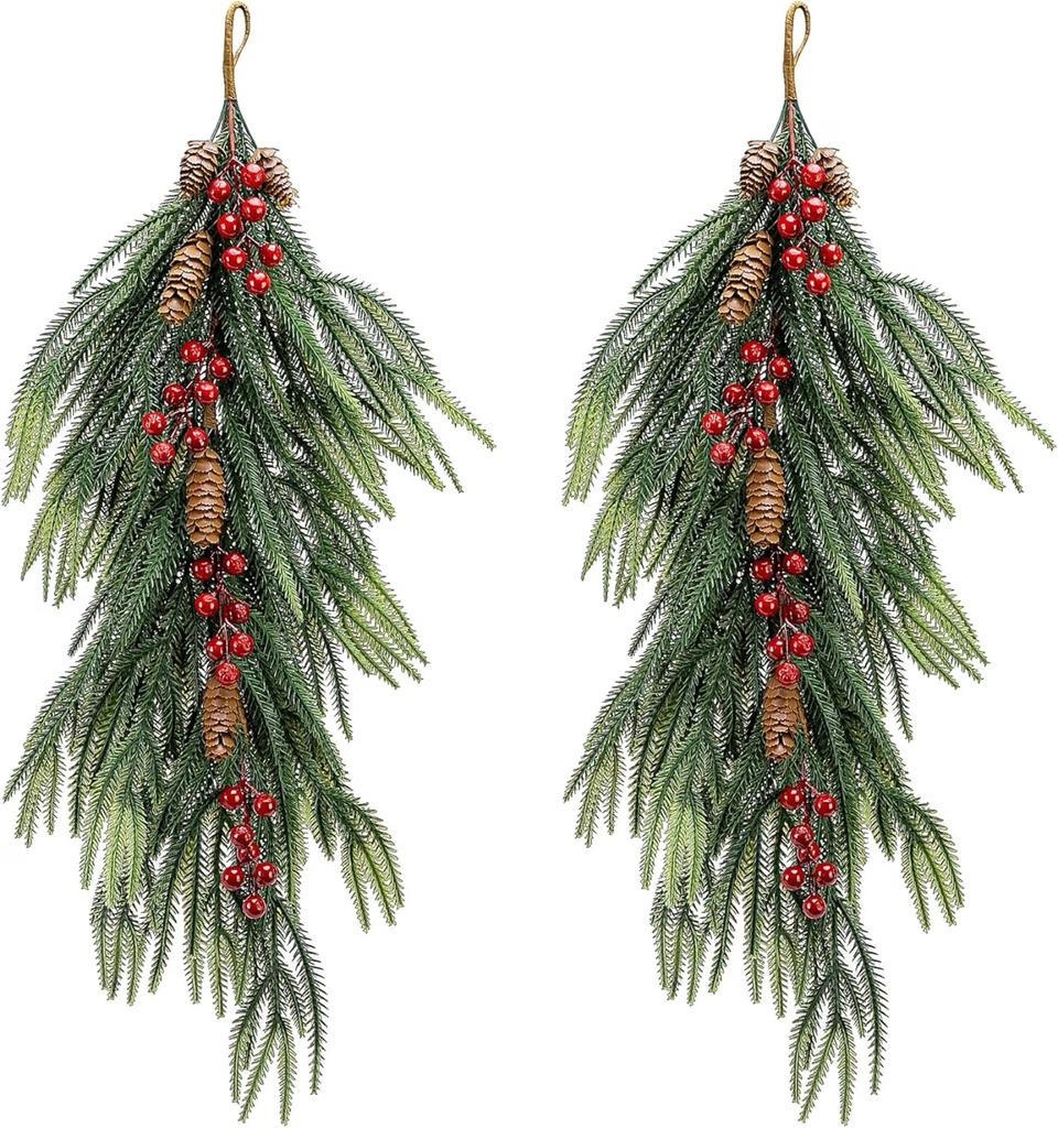 2 Pcs Artificial Christmas Teardrop Swag With Berries And Pinecones, Faux Berry Branch Teardrop Door Swag,