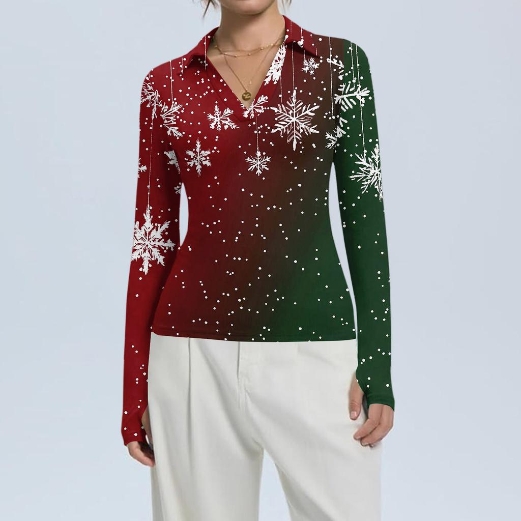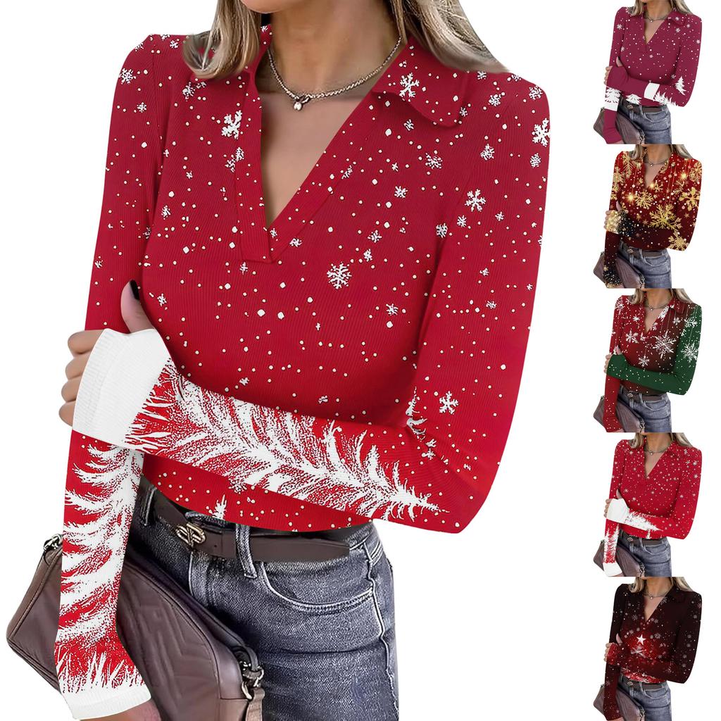 Женская модная повседневная блузка с V-образным вырезом, длинными рукавами и принтом на рождественскую тематику, застегивающаяся на пуговицы