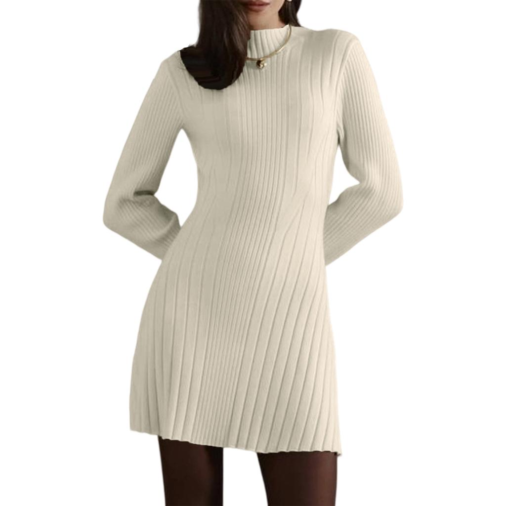 Женское элегантное игривое трикотажное платье А-силуэта с длинным рукавом и полувысоким воротом