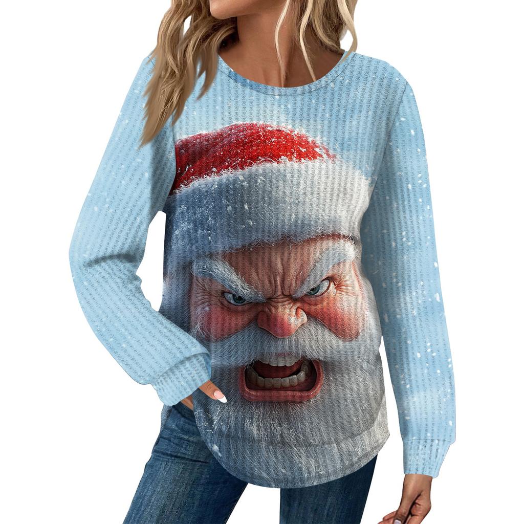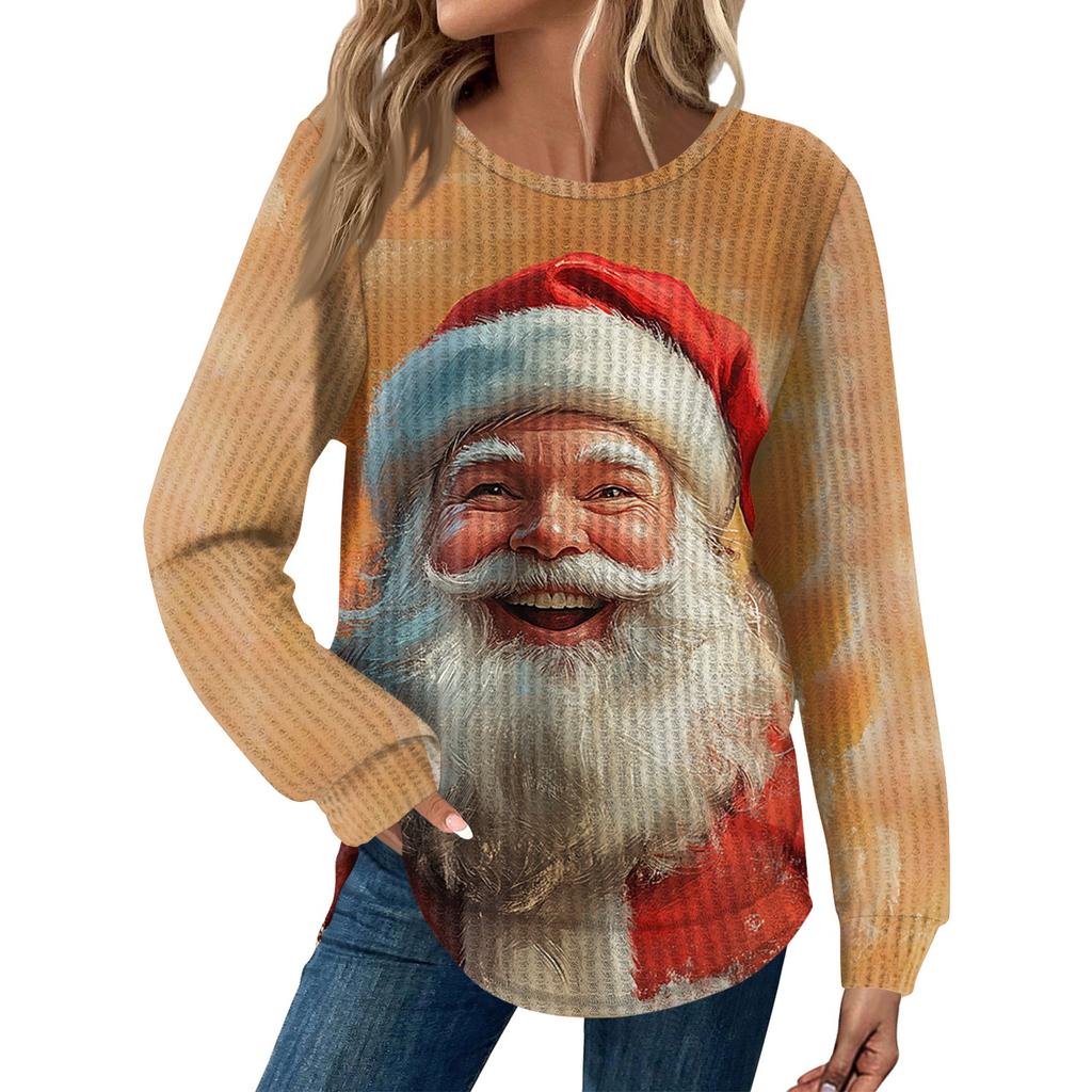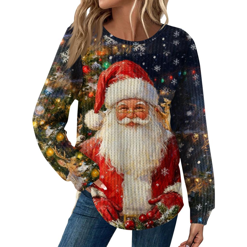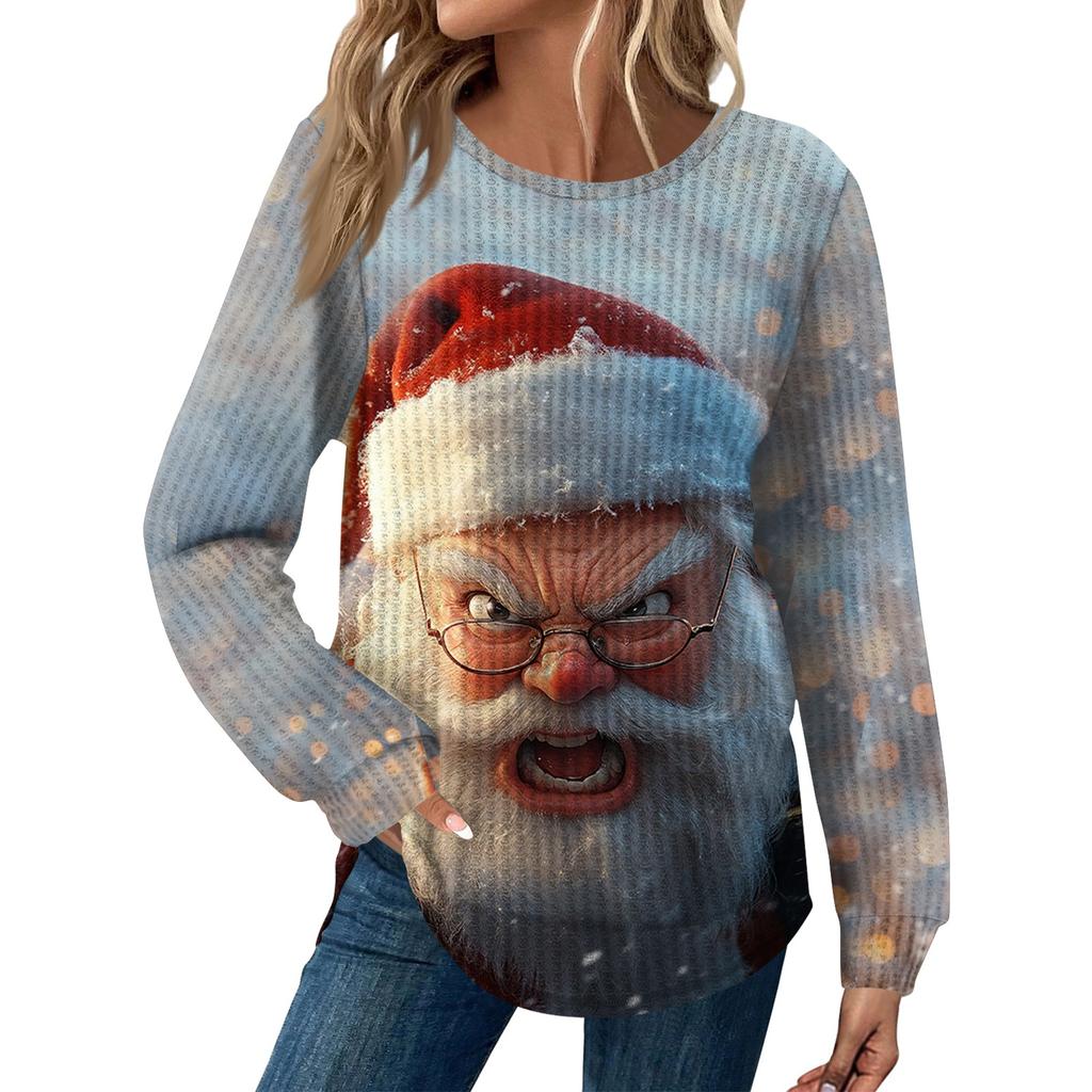 Женская Мода Повседневный Свободный Топ с Круглым Вырезом и Длинным Рукавом с Рождественским Принтом