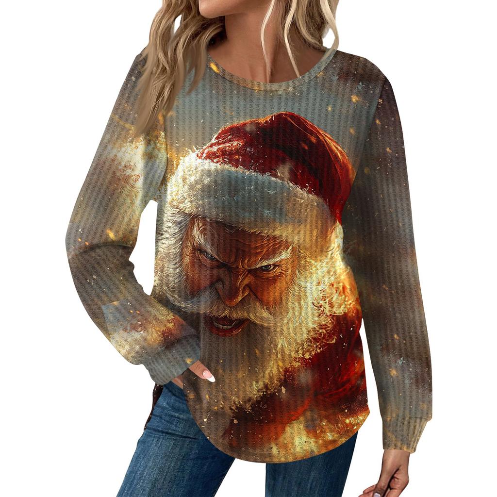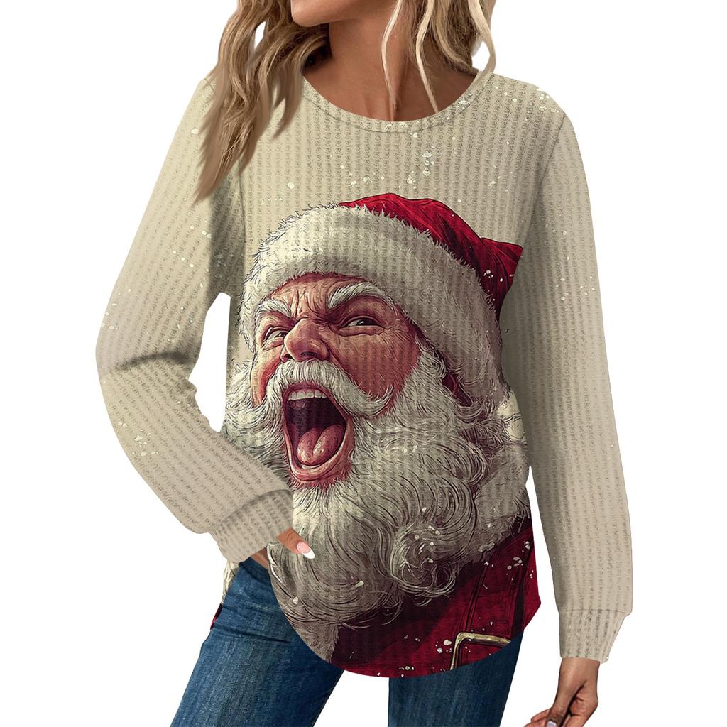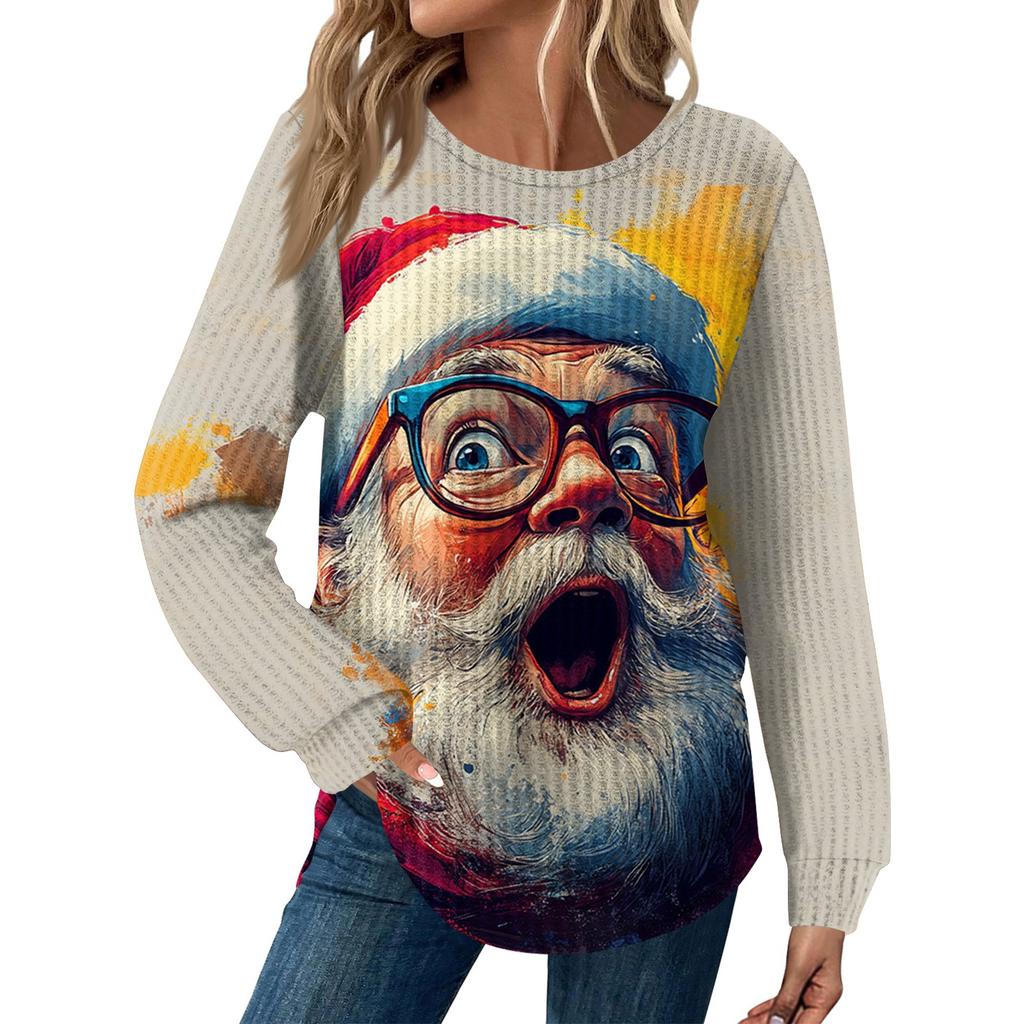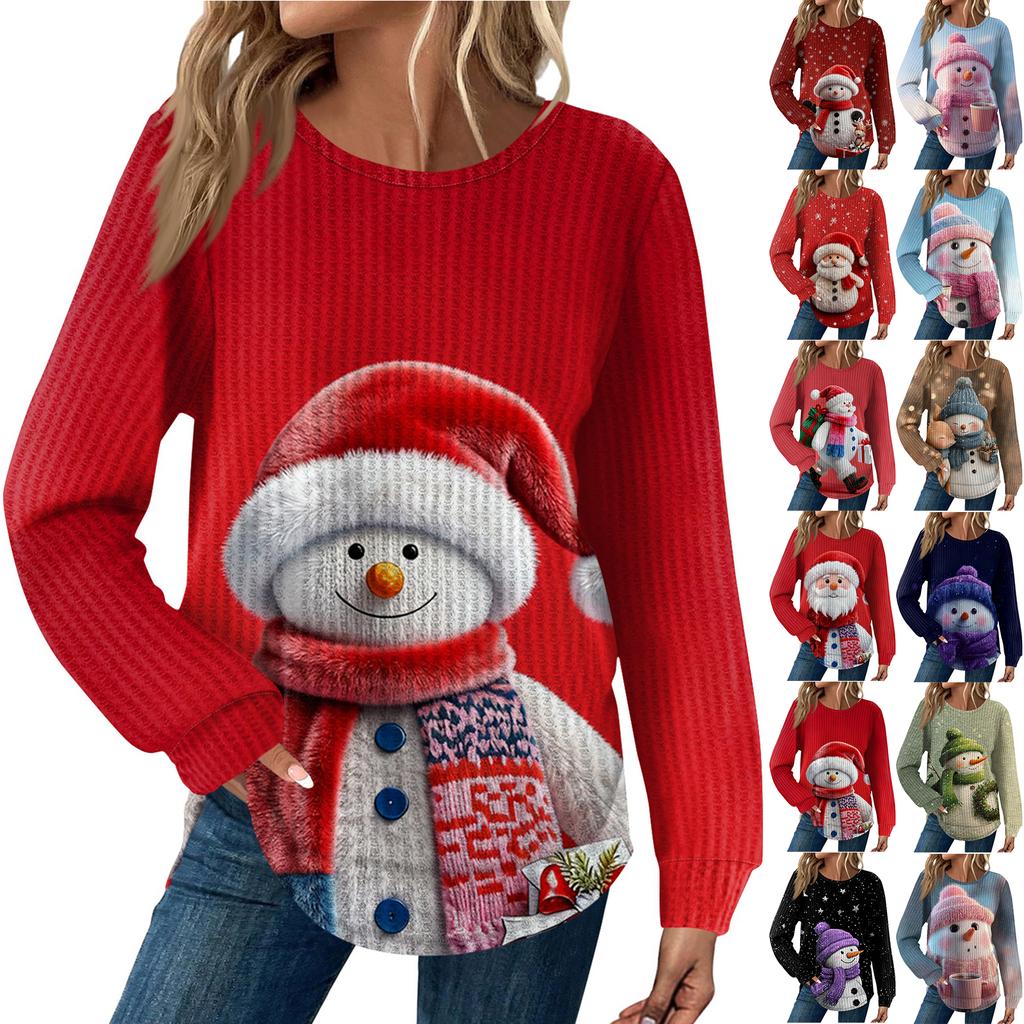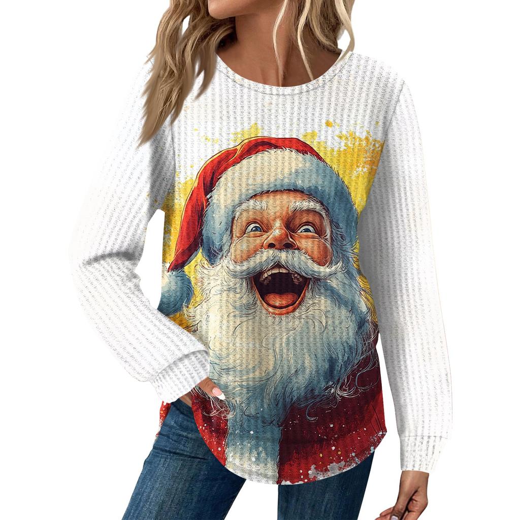 Женская Мода Повседневный Свободный Топ с Круглым Вырезом и Длинным Рукавом с Рождественским Принтом