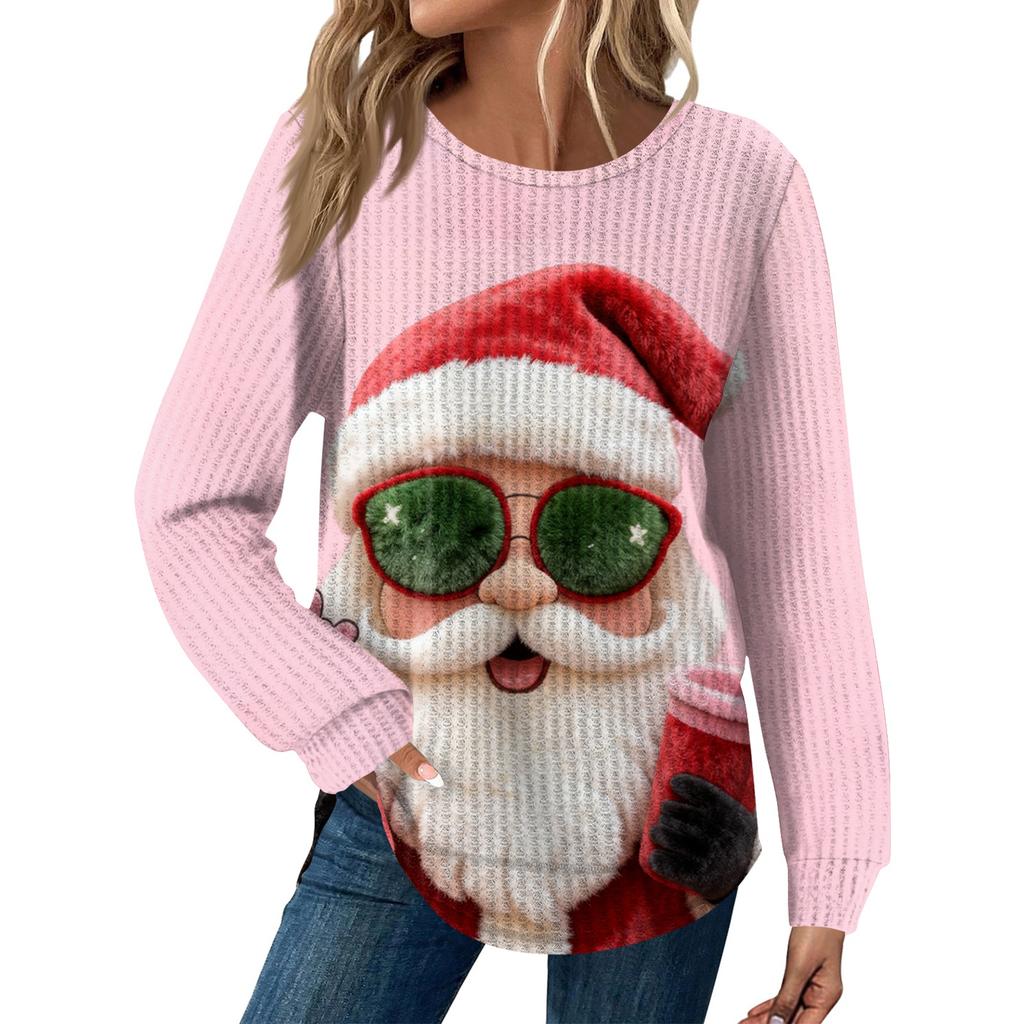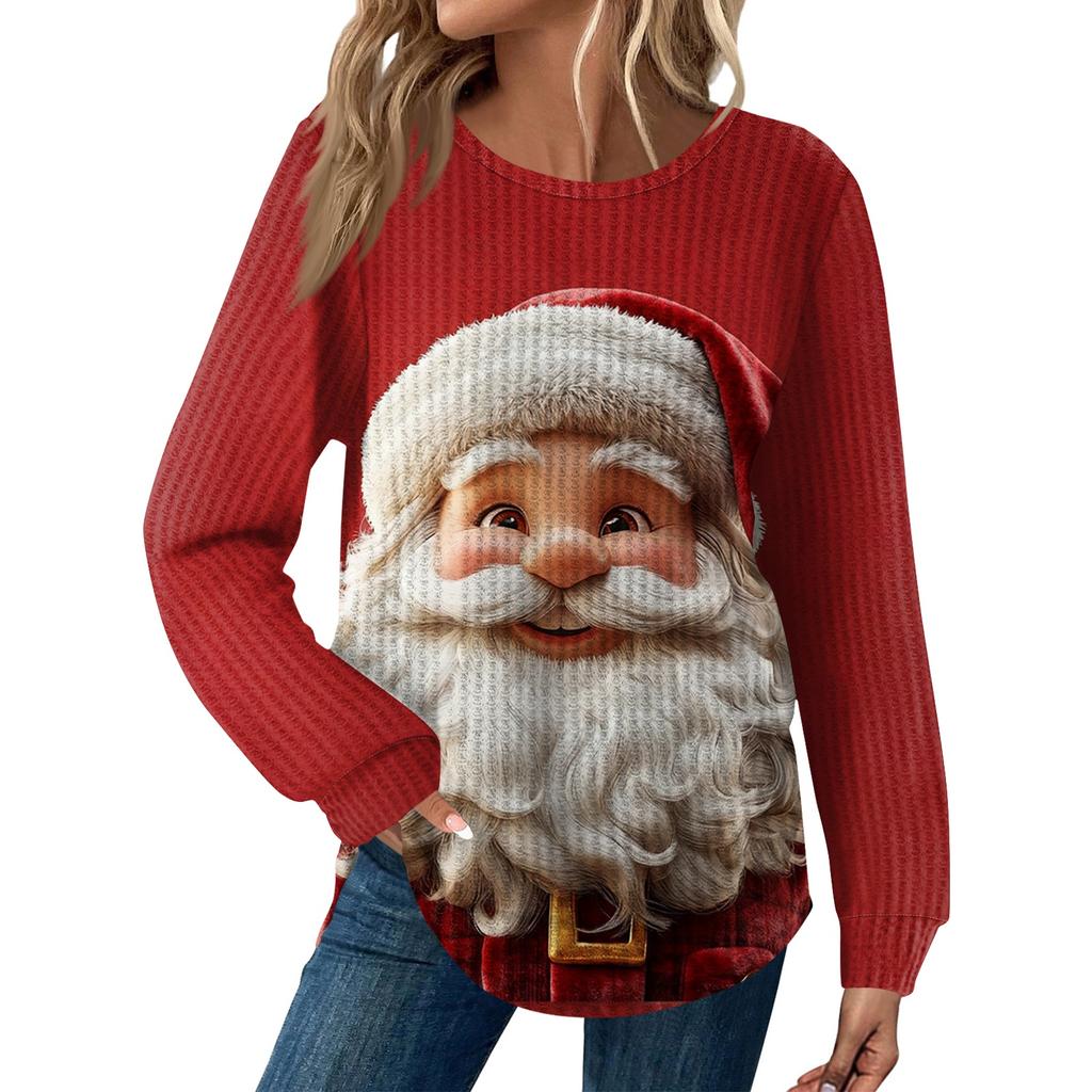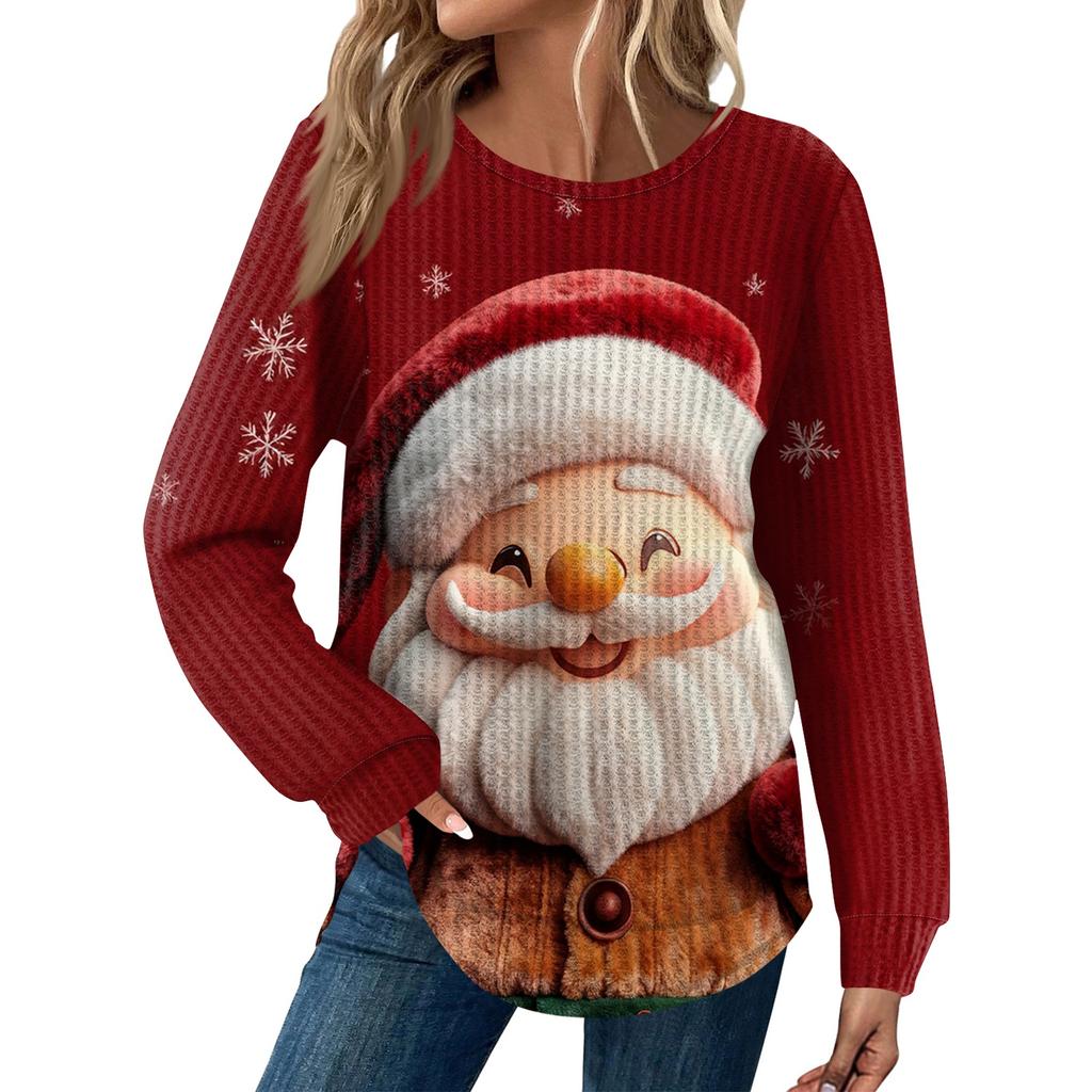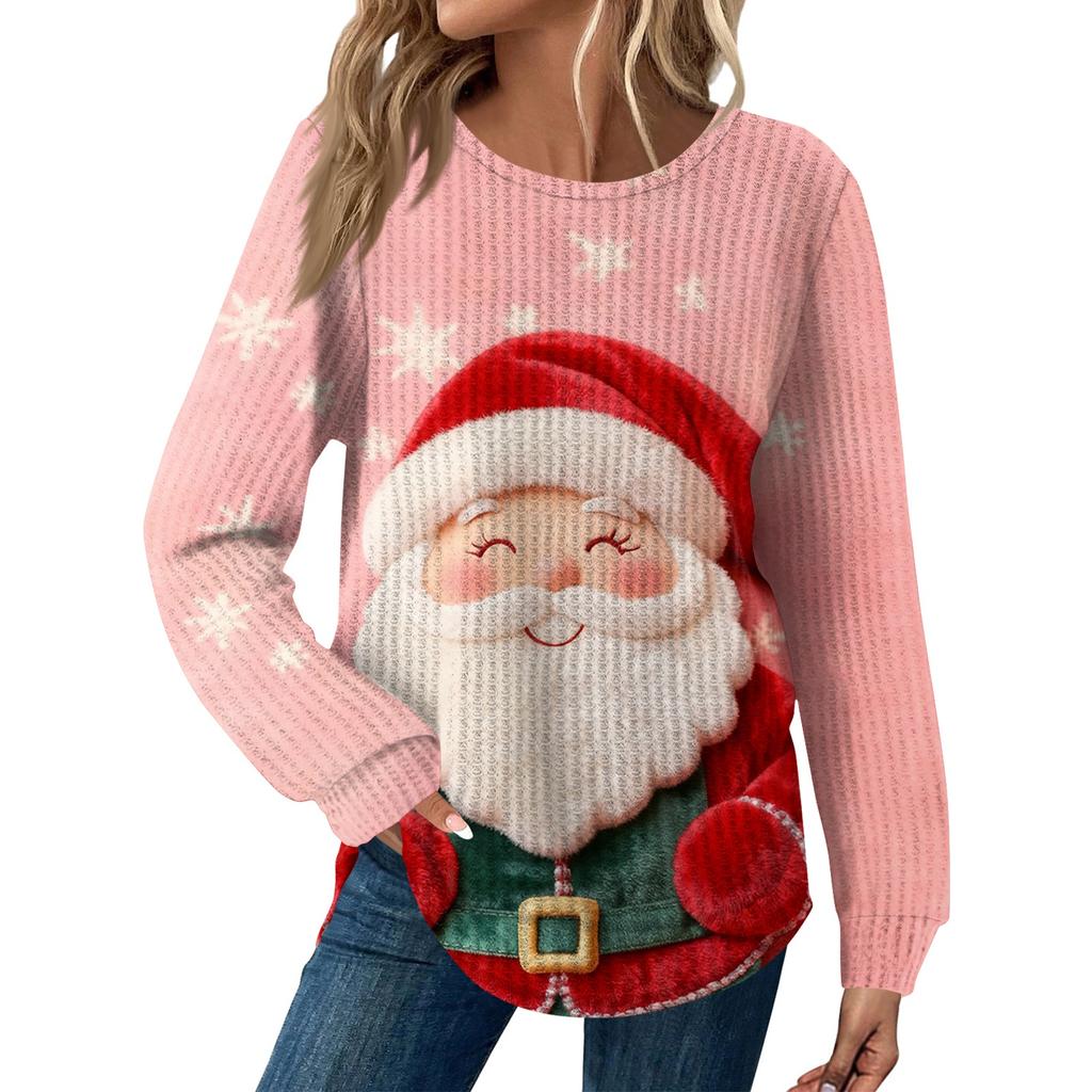 Женская Мода Повседневный Свободный Топ с Круглым Вырезом и Длинным Рукавом с Рождественским Принтом