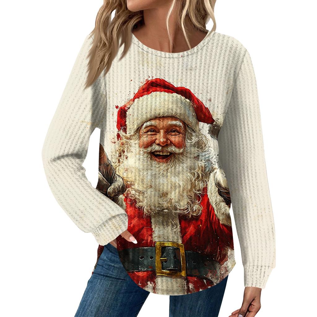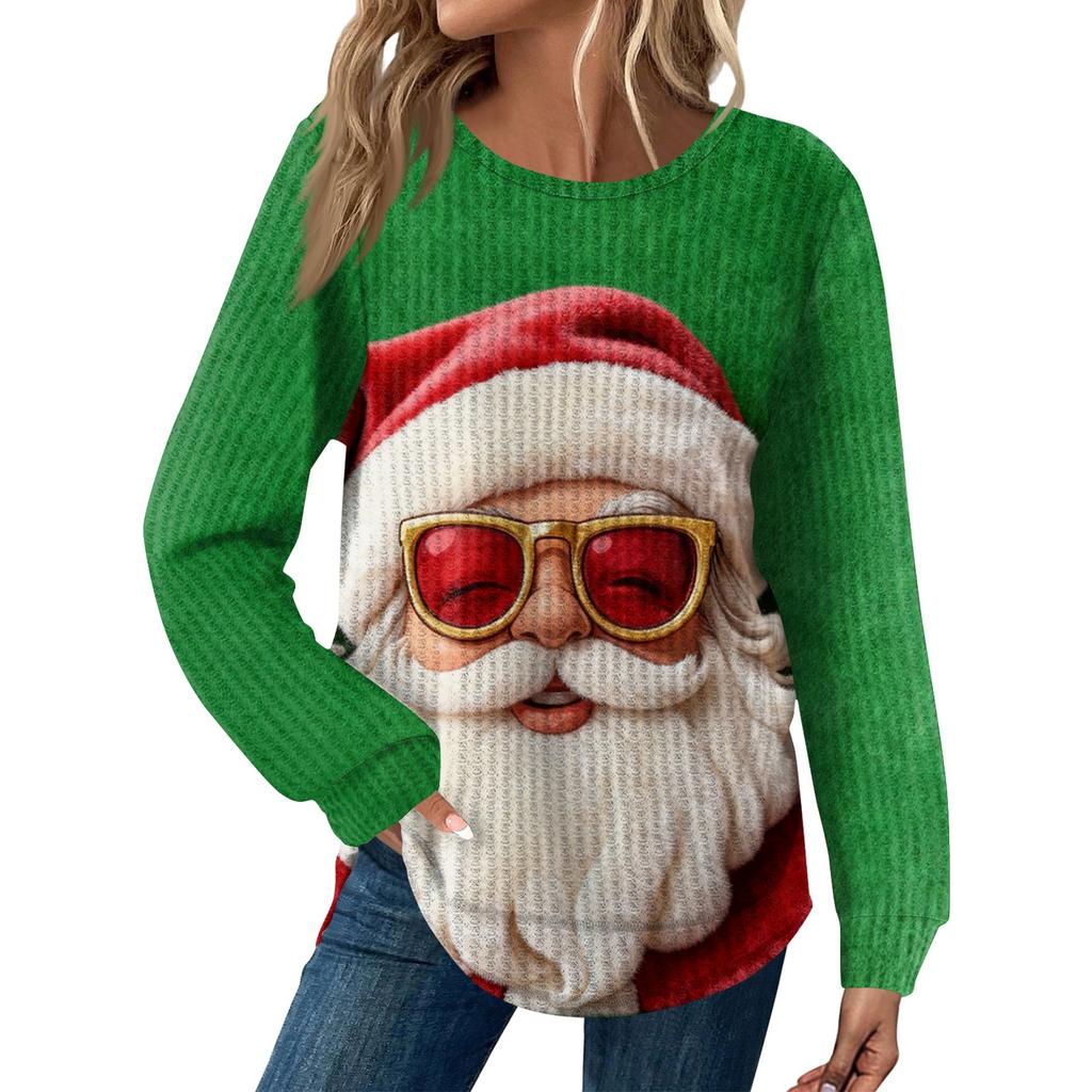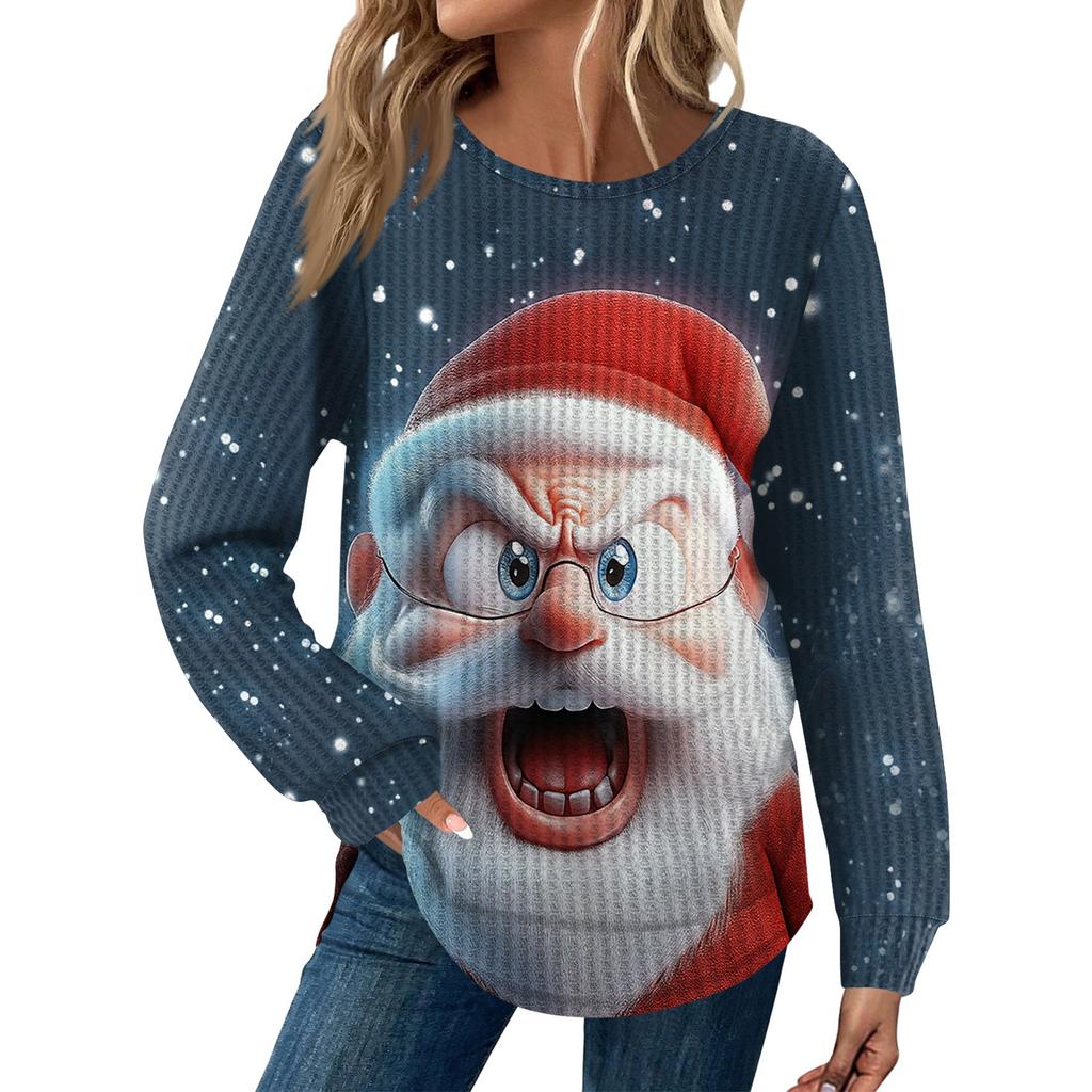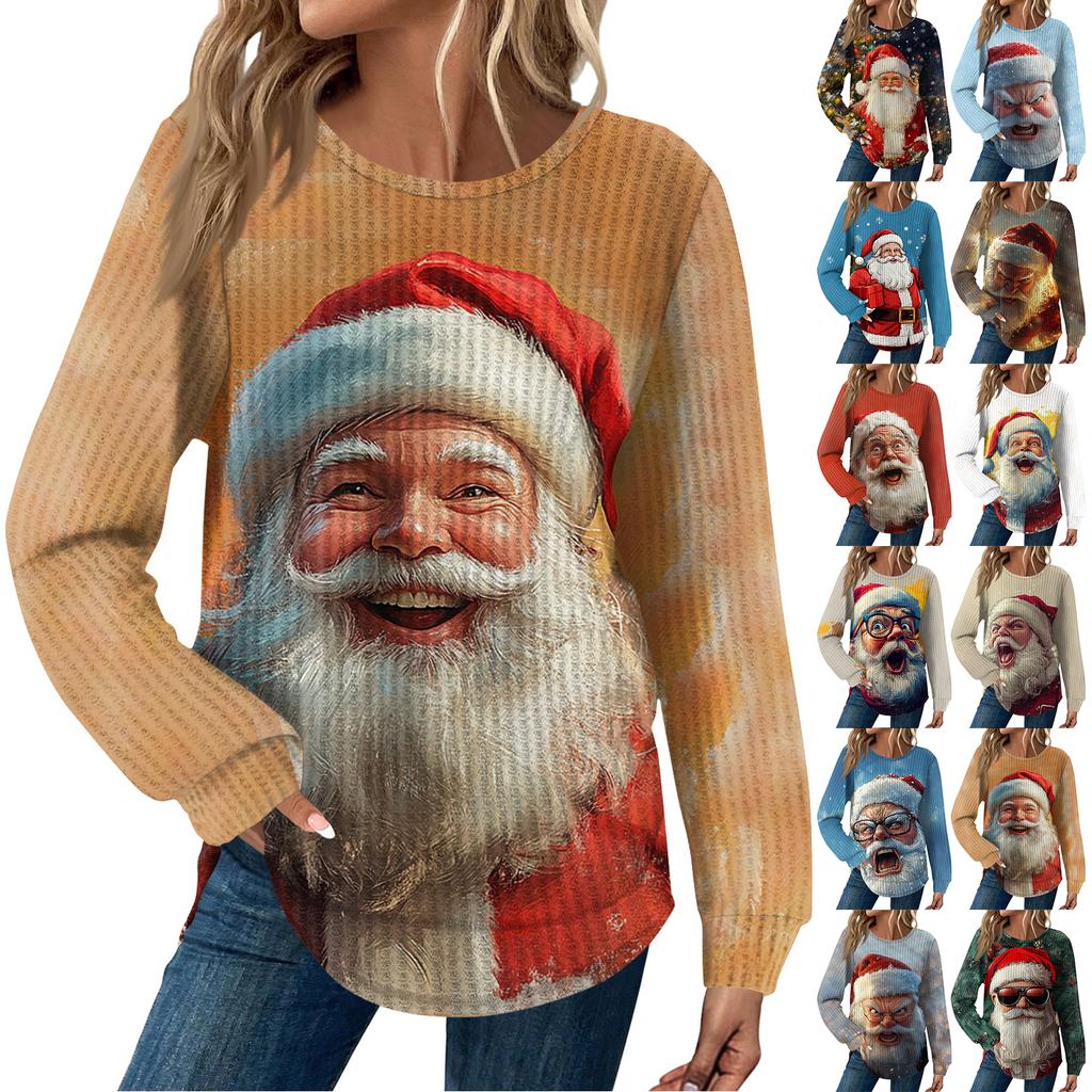Женская Мода Повседневный Свободный Топ с Круглым Вырезом и Длинным Рукавом с Рождественским Принтом