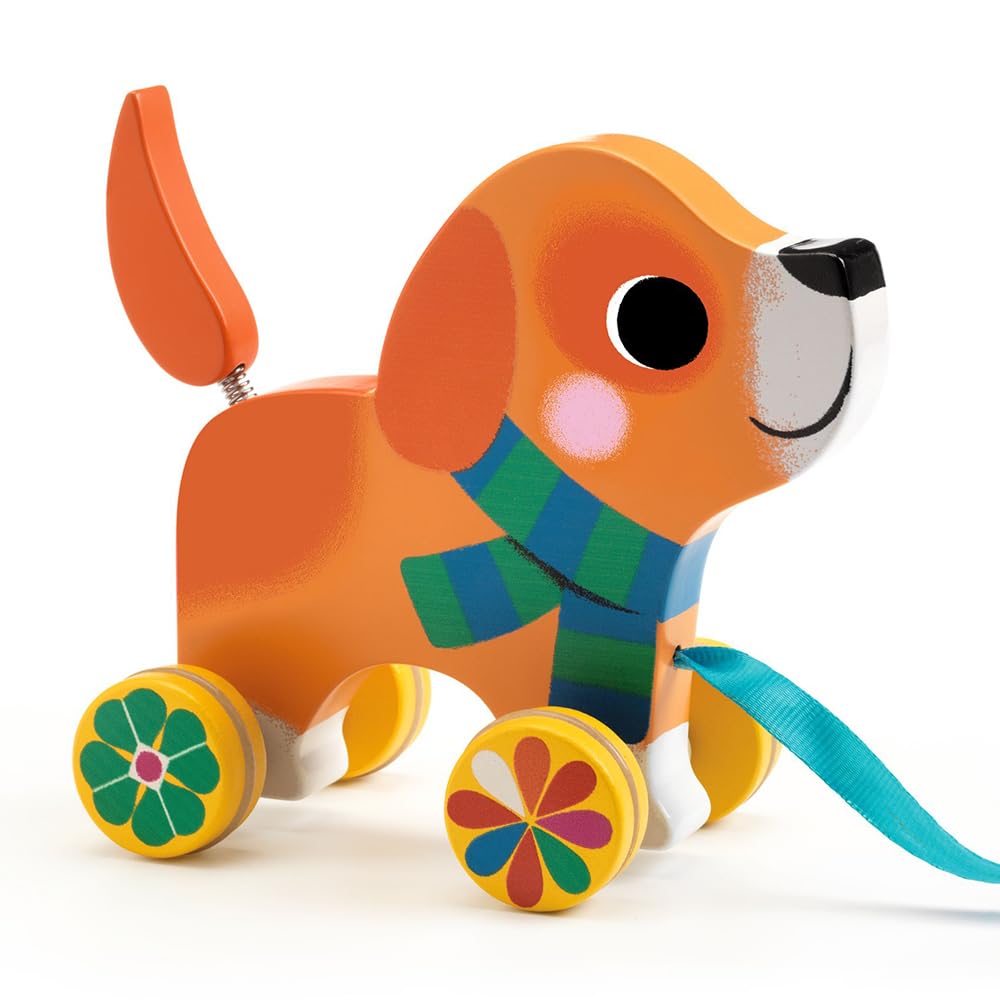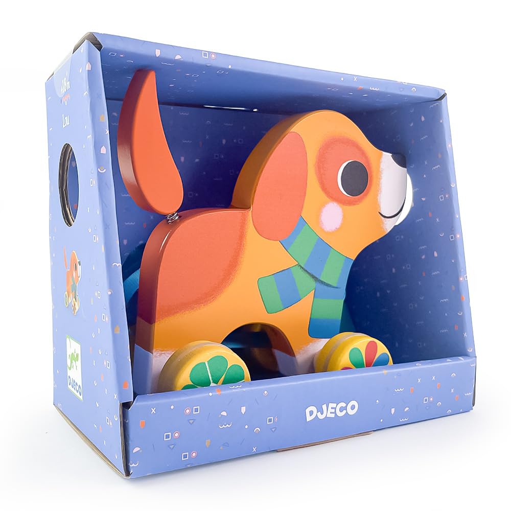 DJECO Lou Pull Toy, Pull Car, Dog Pull Leash, Educational Toy for Walking Practice, Suitable for Babies 1 Year, 18 Months, 2 Years Old, Boys and