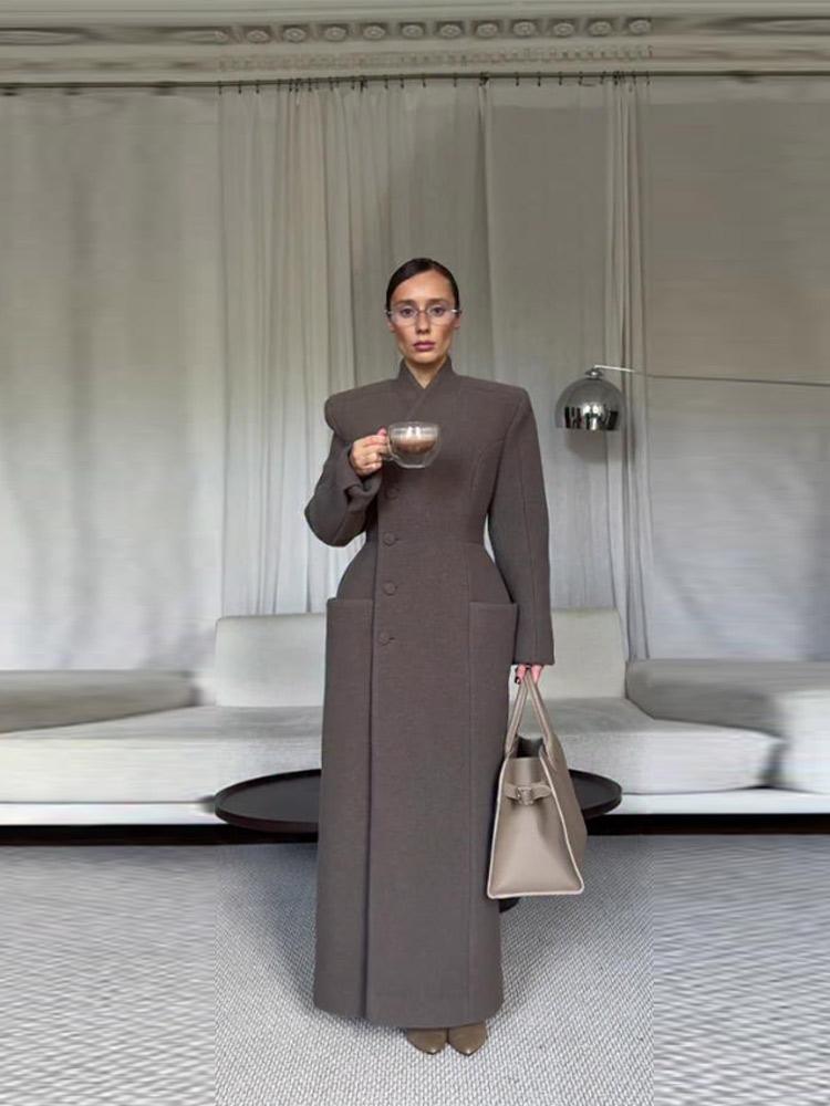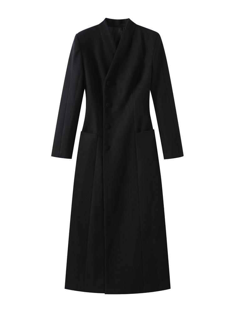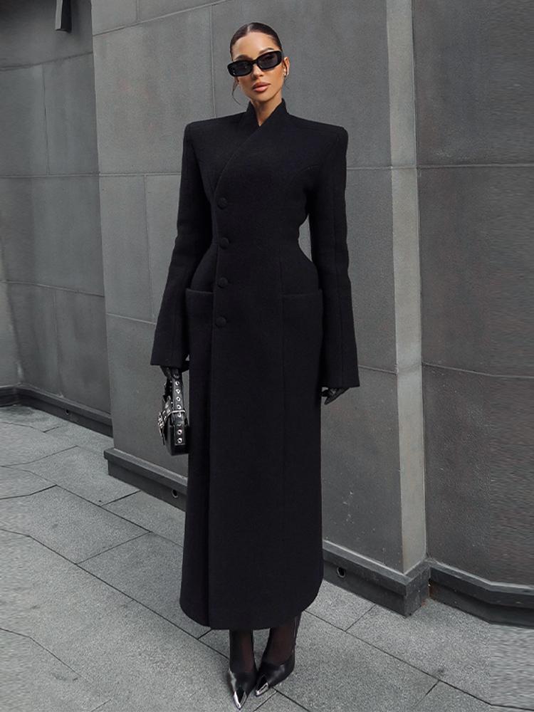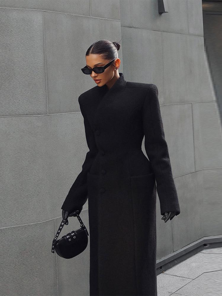 Женское однобортное пальто с подплечниками на талии Женское длинное модное теплое пальто Черный 2025 Новая коллекция