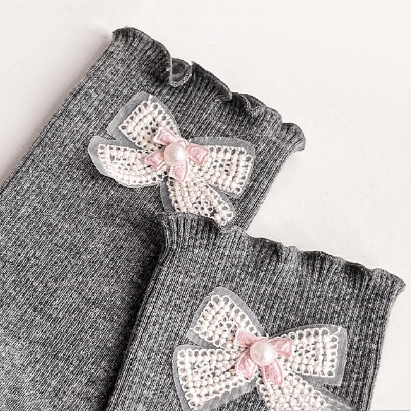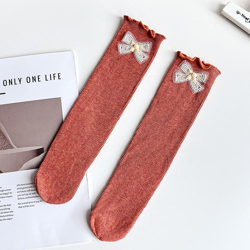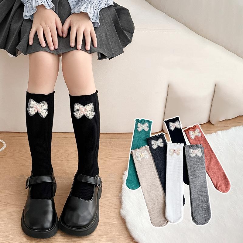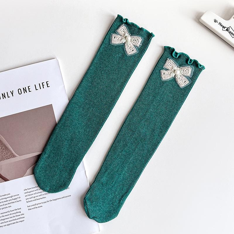Детские носки для девочек, однотонные, средней длины, хлопковые, удобные, до колена, с бантами и кружевной отделкой